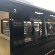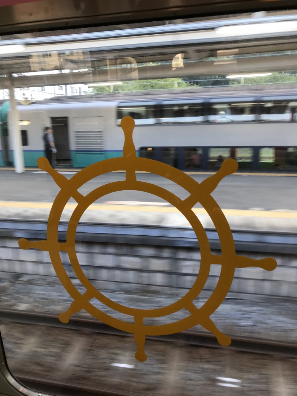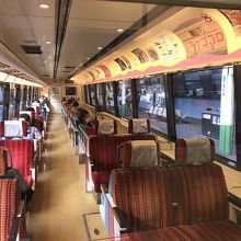 この路線を走る特急料金の必要な特急電車より素晴らしいと思うような黒船をイメージした車内。海側の座席は一部窓側を向いたソファーのような固定席。