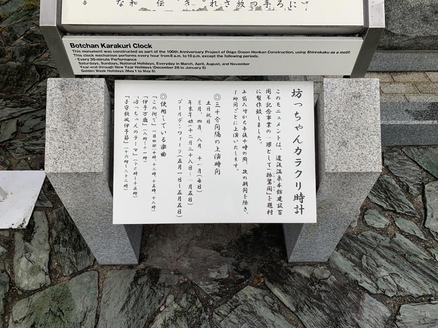 道後温泉駅の目の前。商店街に入る脇にあるからくり時計。基本は1時間ごとに上映で、土日祝は30分ごとのようです。からくり時計としてはそこそこ動きがあり楽しめますが、1回見たら良いかな・・・という感じ。時間が合えば立ち寄るのも良いかも。
