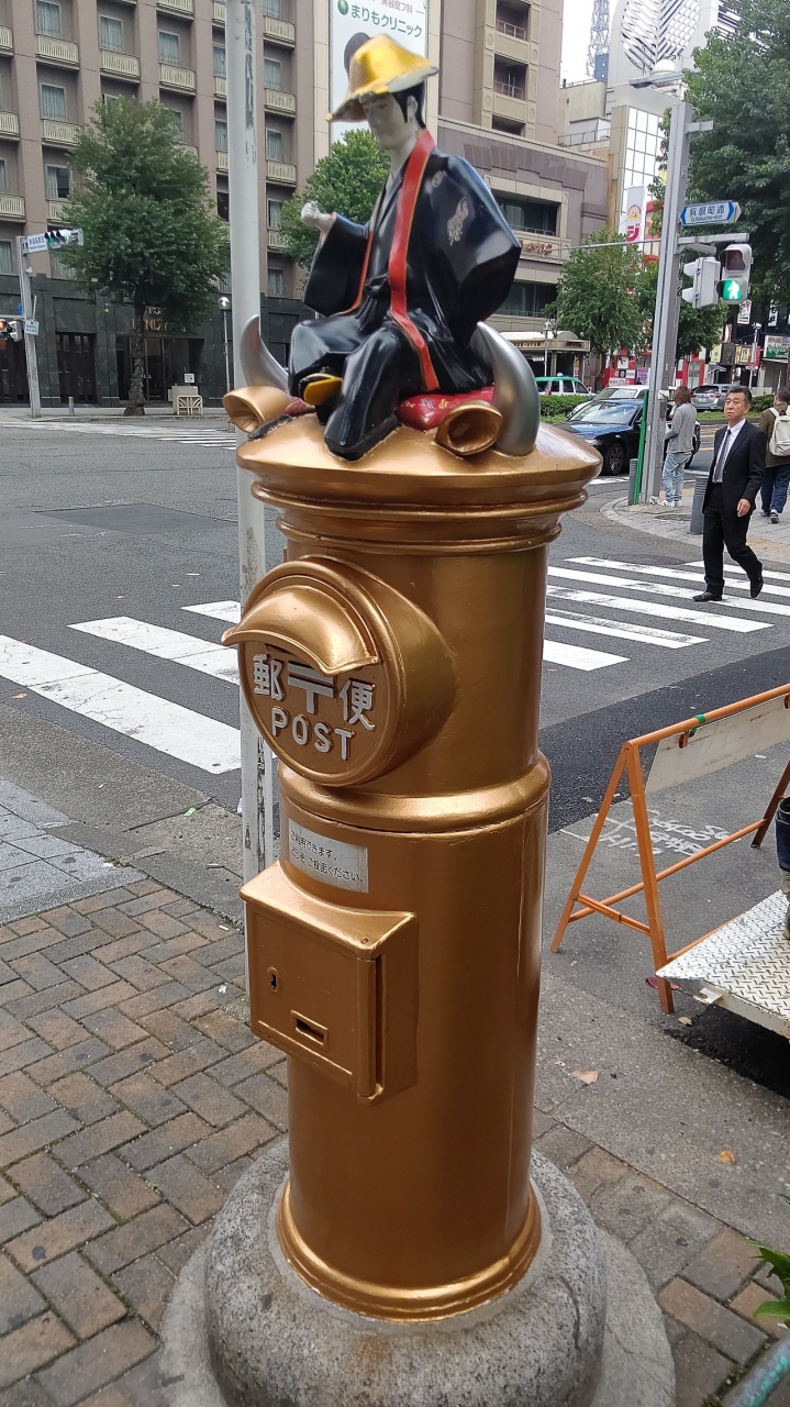 徳川宗春の人形が乗る金色のポスト。ポストは現役です。宗春は尾張藩の7代目藩主。江戸時代に藩の経済を活性化したということで名古屋人の間では有名で、彼らの誇りでもあります。あなたも宗春の志を掲げて、郵便物を投函してみませんか。