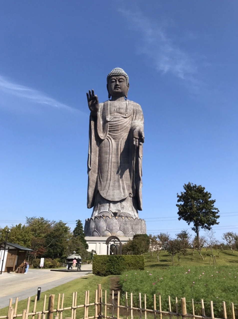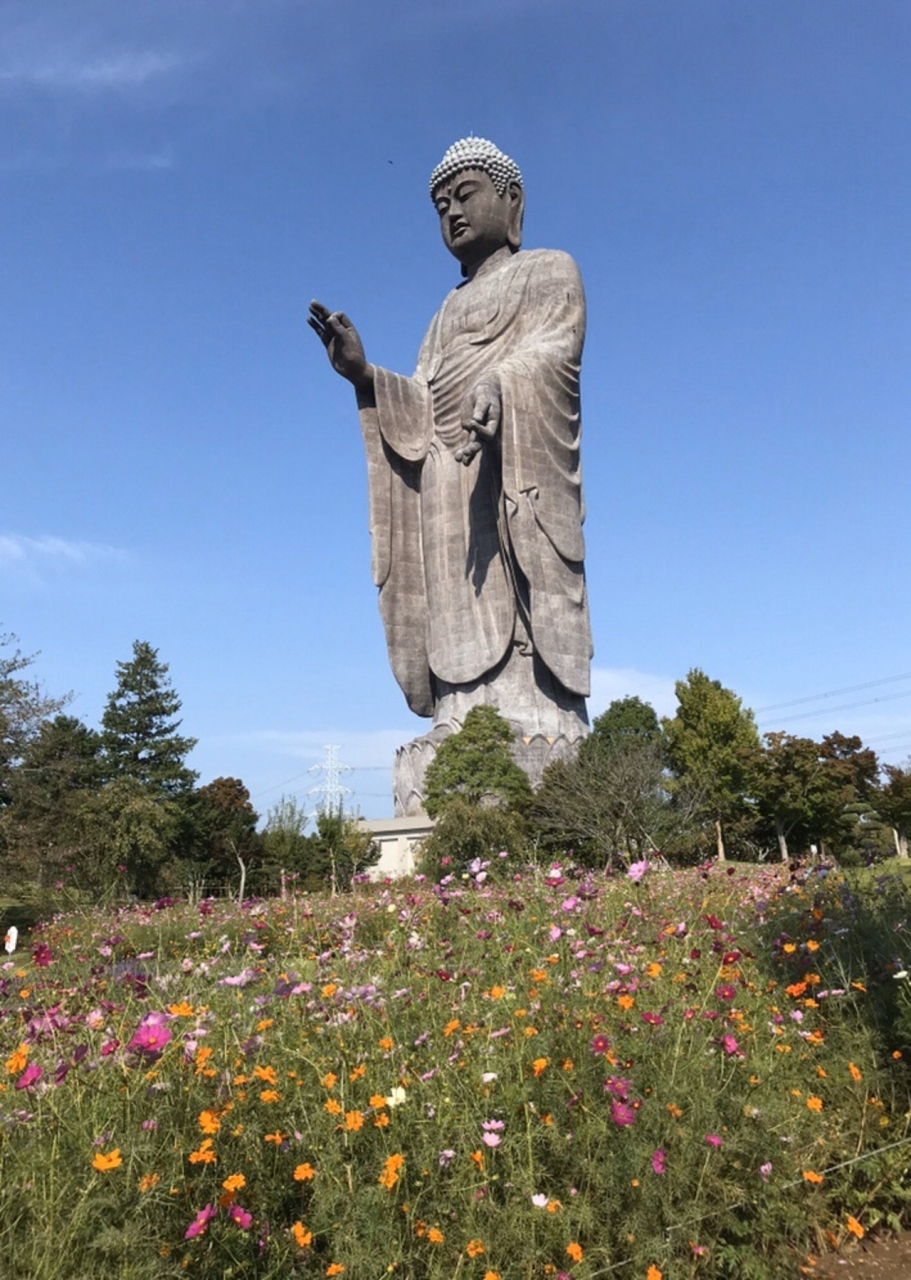 秋に行ったので、大仏様の周り一面にコスモスの花が沢山咲いており、とても素敵な光景でした。