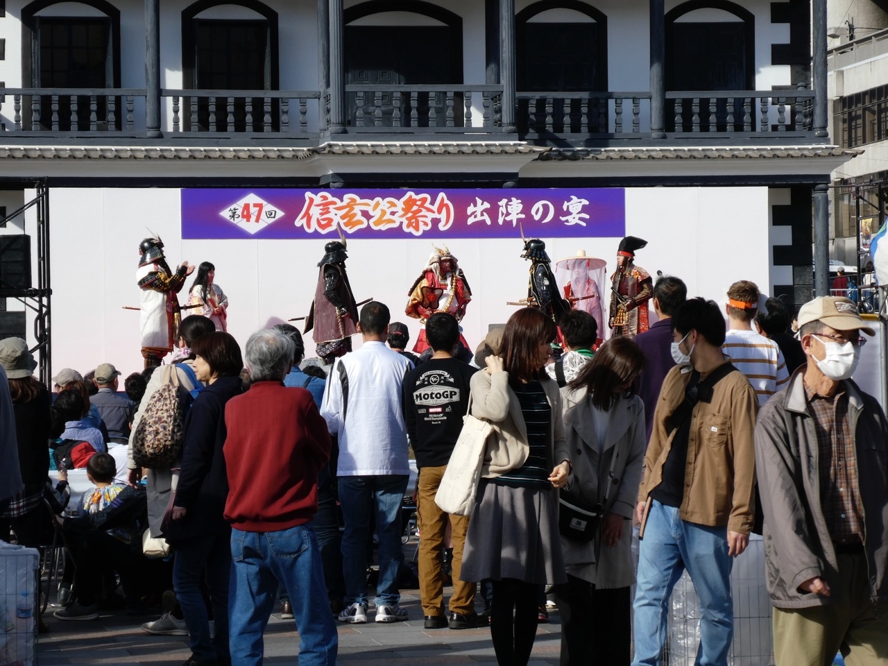甲府駅の駅の北口から出てすぐの広場で武将が舞台に上がっているのが駅のホームから見えたので急遽、下車して見にいきました。