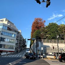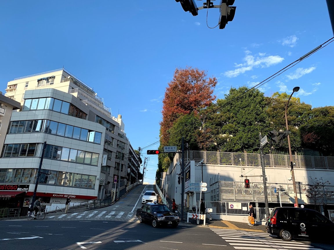 朝方の雨もあがり、環状三号線から見上げる鳥居坂は、美しい青空に縁どられていました。坂の多い港区ですが、鳥居坂交差点近辺の勾配はかなりのものです。坂を下る車は強くブレーキを踏み、車体の前部が道路に擦りそうになりながら走り抜けていきます。その姿が、急坂であることを物語っています。