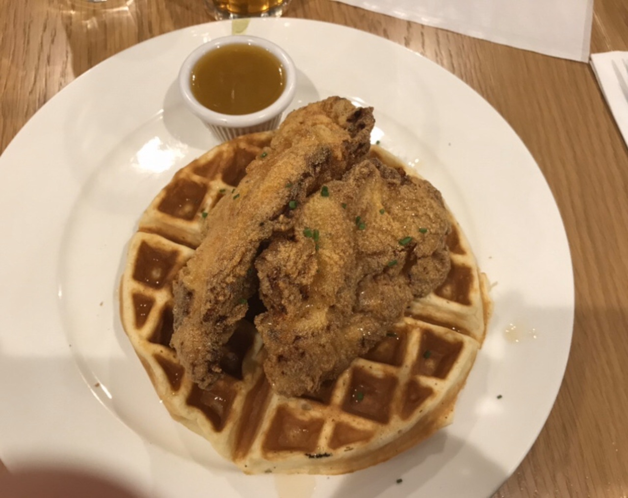 パンケーキと迷いましたが、ワッフルチキンをいただきました。想像よりもずっと大きなワッフルに、どーんと乗っかっているこれまた大きなフライドチキン。朝からかなりのボリュームですが、頑張って完食。とても美味しかったです。