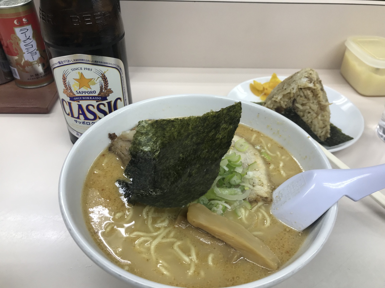 私はしょうゆのあっさり(750円)と瓶のサッポロクラシック(600円)、チャーシューおにぎり3個(510円)を注文。