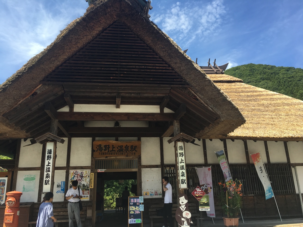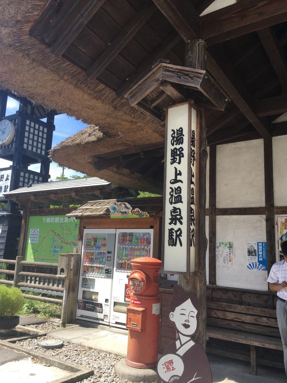 会津鉄道の湯野上温泉駅です。茅葺き屋根の駅舎で有名で、中には囲炉裏があり、火が入っています。