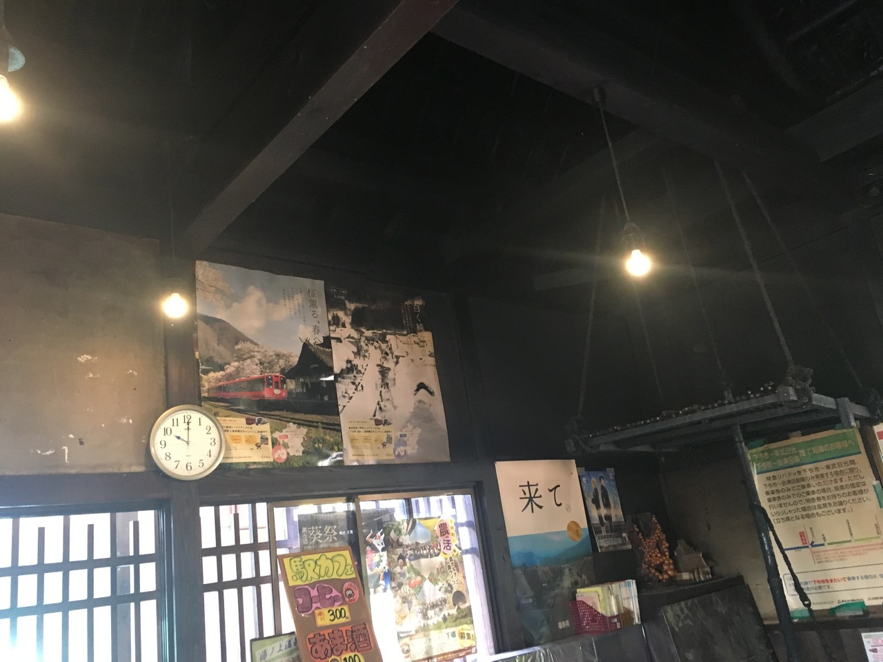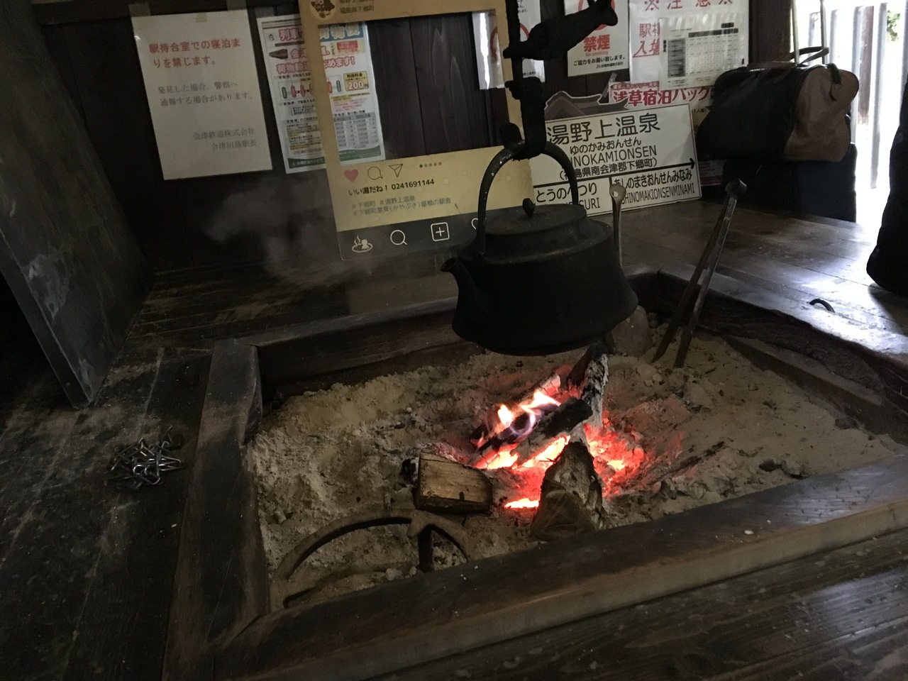 幼い頃、祖母の家で見た囲炉裏と同じ。黒光りする囲炉裏端に座って列車を待つのはなんだかとっても癒されます。