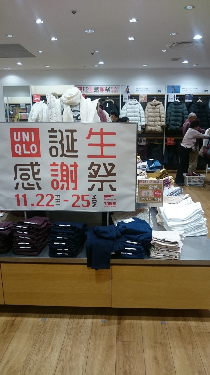 川越駅前のユニクロはアトレ5階にあります。今日はユニクロ誕生祭、冬物が安く買えました。アトレにはGUもできました。