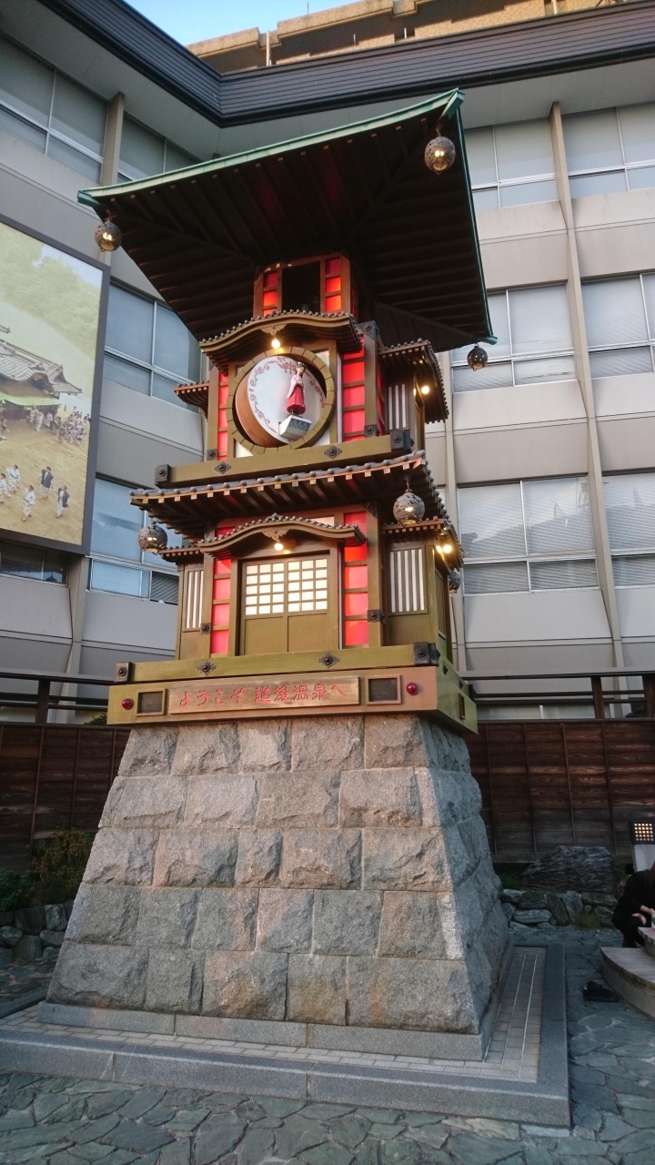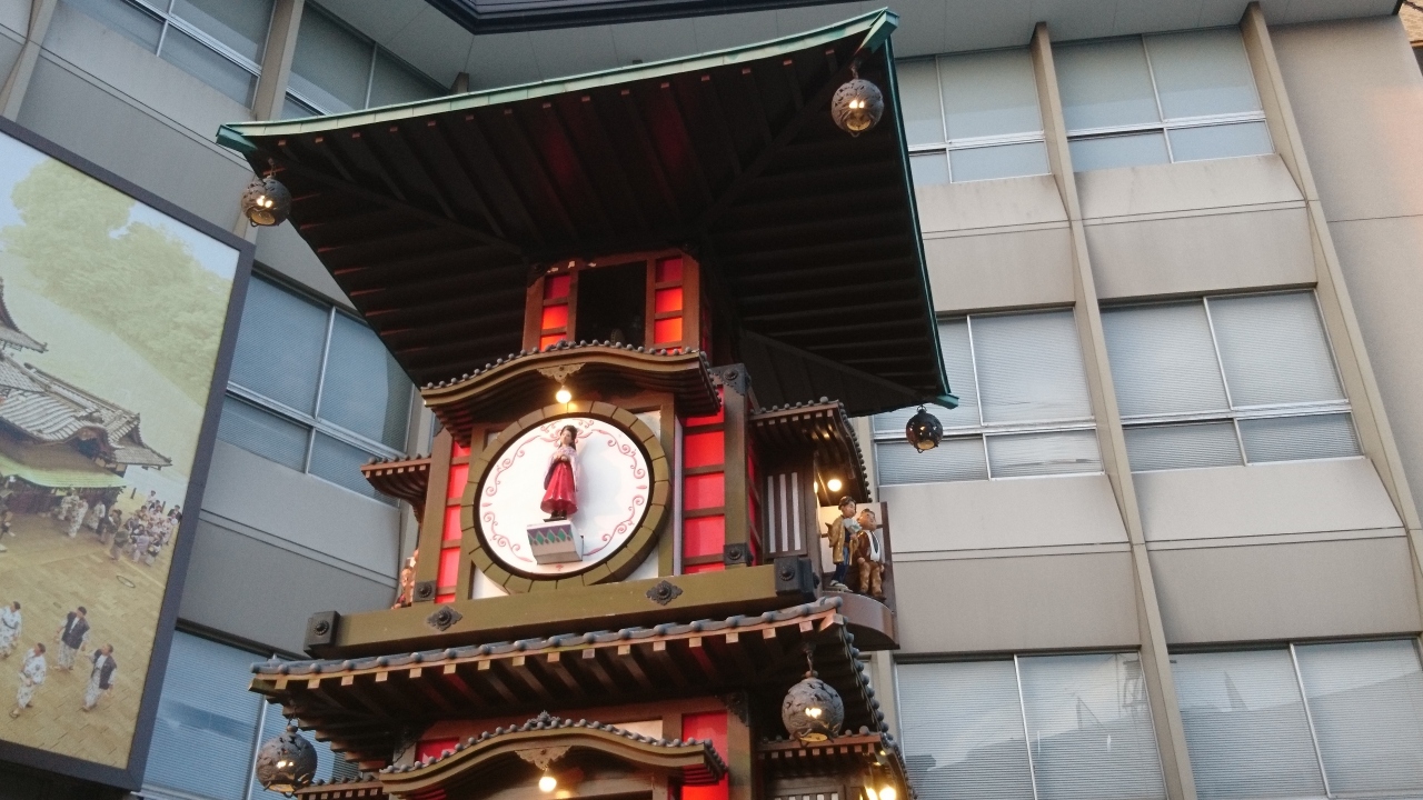 道後温泉の商店街の入り口にあるからくり時計。1994年の道後温泉本館建設100年事業で建てられました。1時間ごとに音楽が流れ、ユーモラスな坊ちゃんの登場人物が出てきます。観光地を盛り上げる道後温泉の取り組みの一つですね。