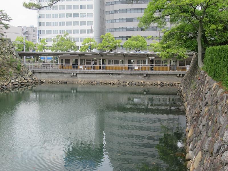 橋の上からは海水を引き込んだお堀、そしてお堀越しに高松琴平電鉄(ことでん)の高松築港駅に停まる電車も見ることができます。