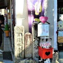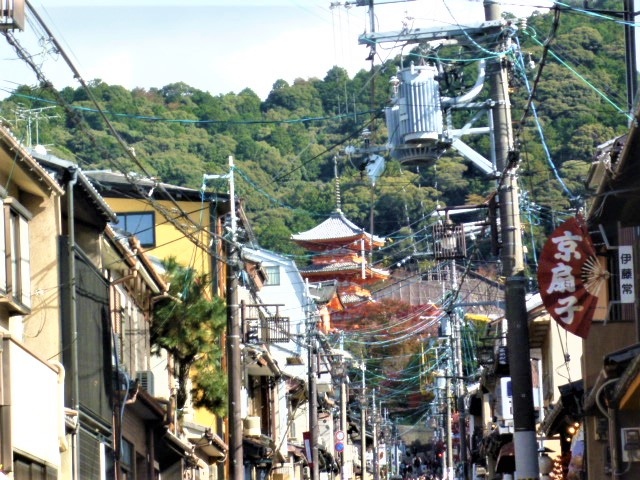 `清水寺に行きたい`と五条大橋から市バスで乗って`五条坂or清水道`を選択するか迷ったいたら、バスは満員でしたが、乗客が(手に観光マップ!)一斉に[五条坂]で降りたので真似をしましたョ。 交差点で二人の交通案内員が`左側には歩道がないので右側へ`…交差点を右側に渡ると古い道案内で`左 清水寺道`に♪ で、五条坂(狭い坂道)は観光バス/タクシー/乗用車/歩行者(向う人/帰る人)で超-混んでいました。 次の古い道案内で`ちかみち 茶わん坂`があったので`ちかみち`を選びました…見えましたお店屋さん/電柱の電線/`三重塔゛が(^^)