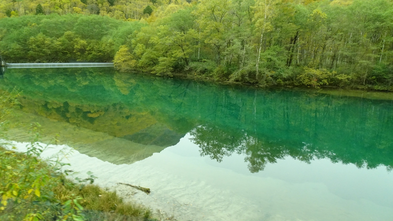 大正池のバス停から舗装されていない階段を下ると大正池に出ます。