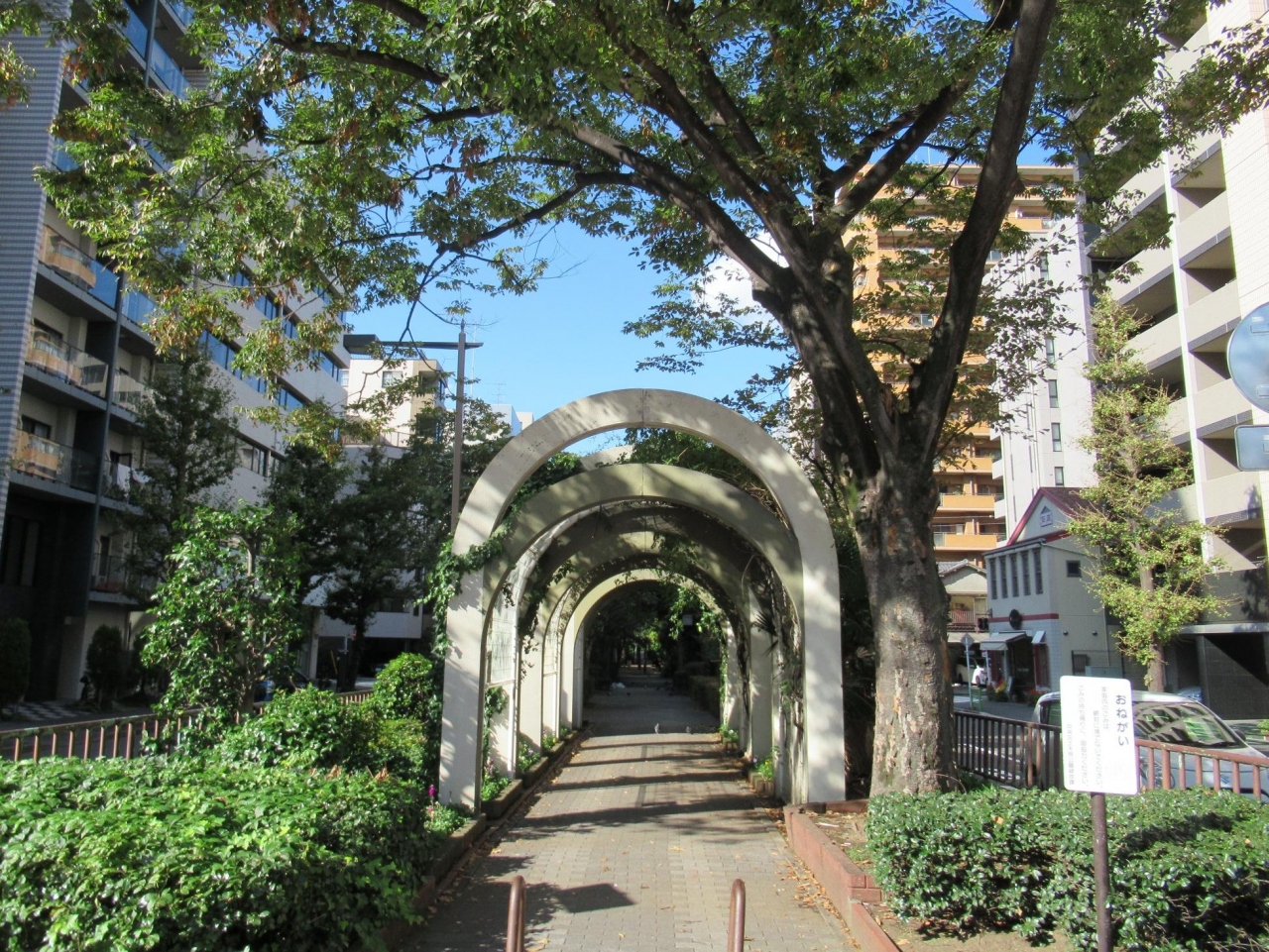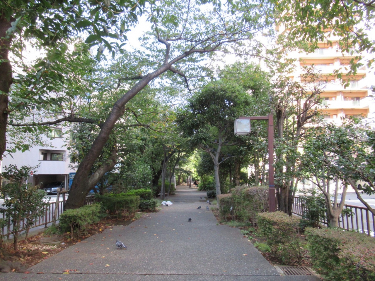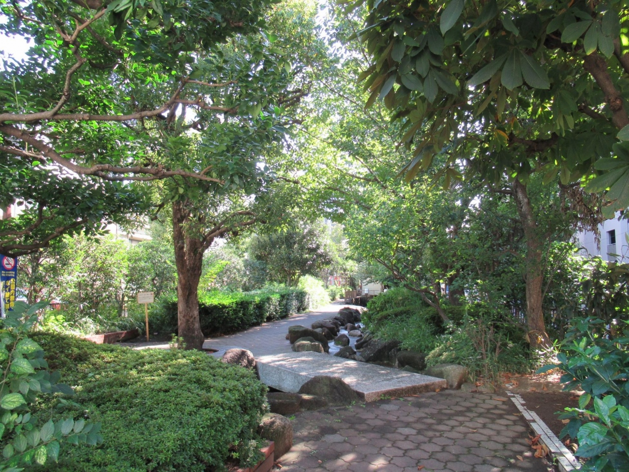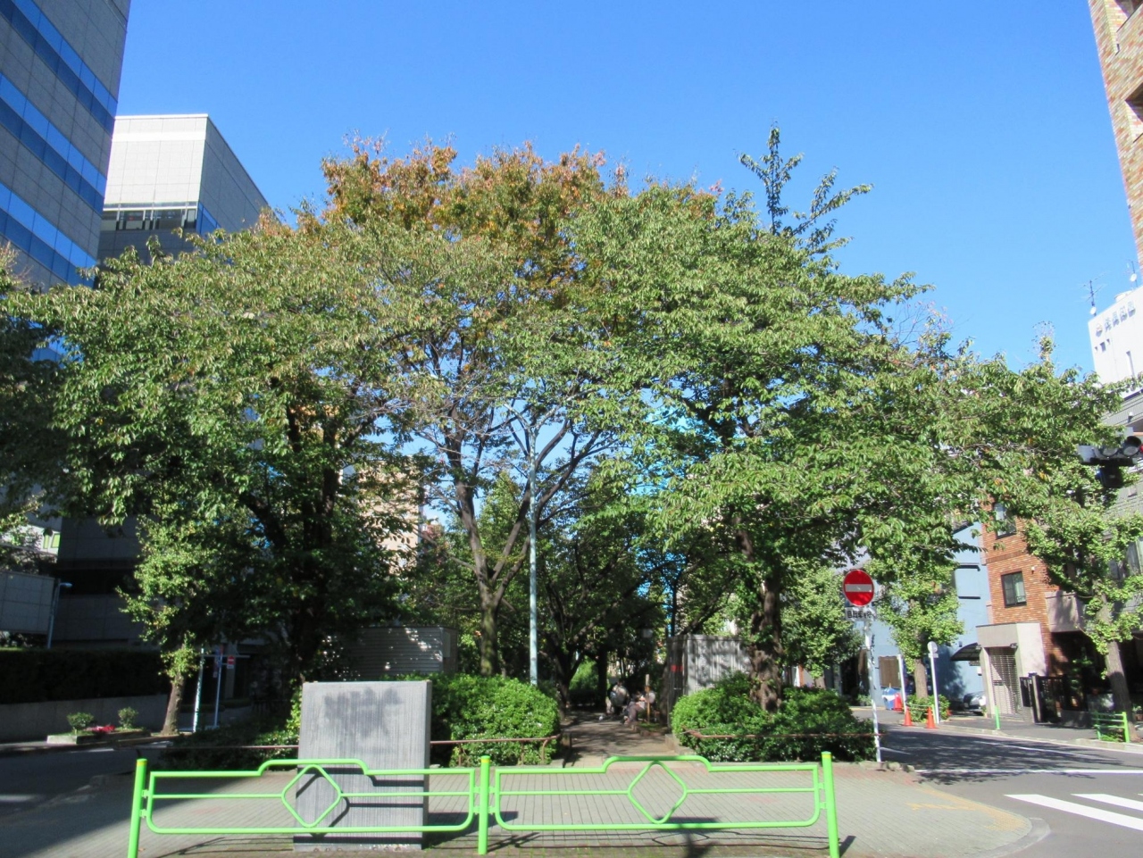 中央区日本橋浜町界隈を散策の折訪ねた一つがここ 浜町緑道 で、西隣りの日本橋人形町との境界を北西方向から南東方向に凡そ300m続いている緑豊かなところです。