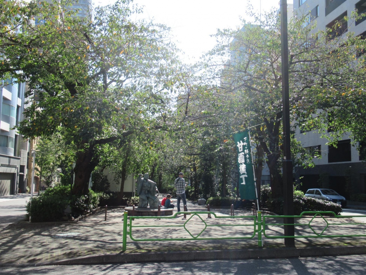 緑道に北西側から入って直ぐの左手に、「漢方醫学復興之地」の石碑があり、途中甘酒横丁と交差するところには、「勧進帳の弁慶像」があるのでこの付近の歴史が分かります。