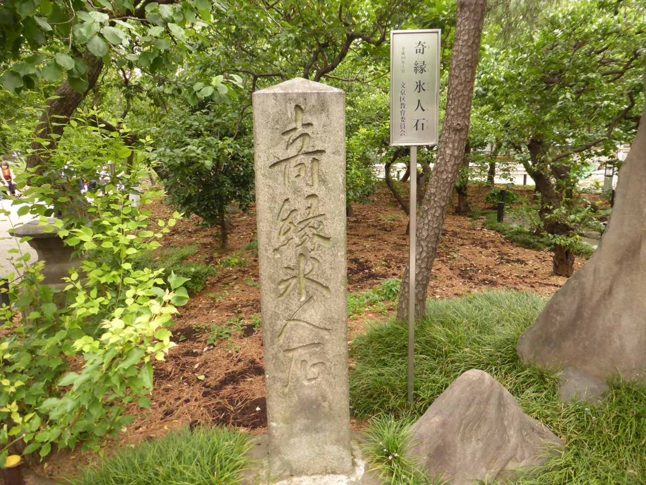湯島天神の梅園の一角にある碑。寛永3年(1850年)に建てられたもので、「きえんひょうじんせき」と読みます。これは迷子がでたとき、子の名を書いた紙を右側に貼って探し、迷子がいた時、その子の特徴を書いた紙貼って知らせた「迷子しらせ石標」の名残り。こういう連絡所の役割を果たす石標が必要なほど賑わっていたという事の証で、当時の賑わいがどれ程のものだっただろうと想像するのも面白いです。