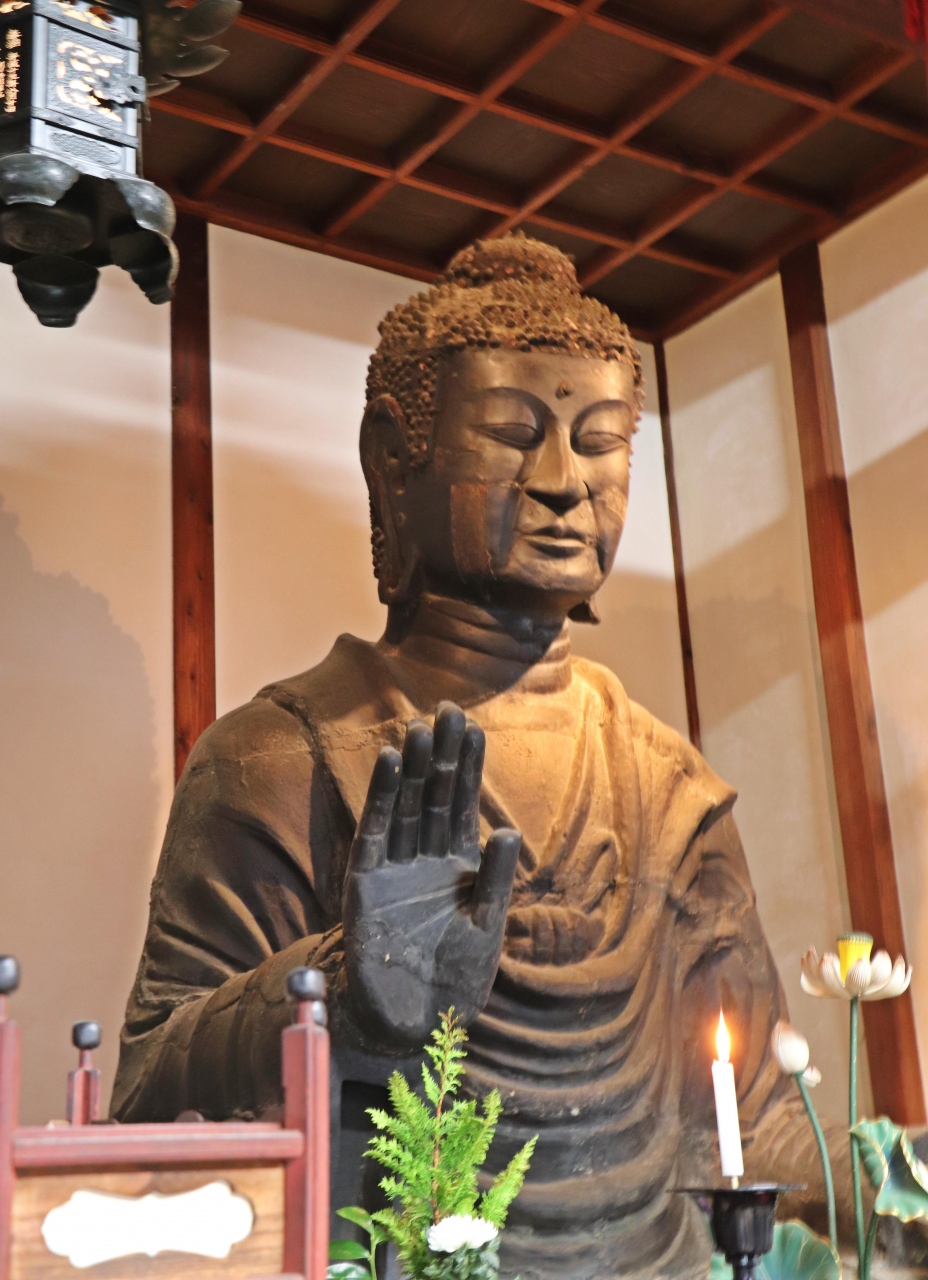 仏像の前に座り、そのお顔を拝見すると、京都のお寺にある細面の仏像とは異なるふっくらとした優しげな頬のライン。