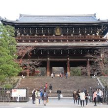 知恩院の入口に造られた重厚で大きな門です。木造の門としては日本最大で、一見しただけで圧倒され、国宝に指定されるだけのことはあると感じられる門です。内部は仏堂になっているそうで、仏像が安置され、壁や柱には色彩豊かな絵画が描かれているとのことです。七不思議のひとつ、門を作り上げた御夫婦の白木の棺も納められているそうです。残念ながら内部は非公開ということで、仏像や絵画、白木の棺などは見られませんでした。知恩院には他にもいくつもの堂々とした歴史を感じる門が存在しますが、三門のおかげでどの門もこじんまり見えてしまいます。