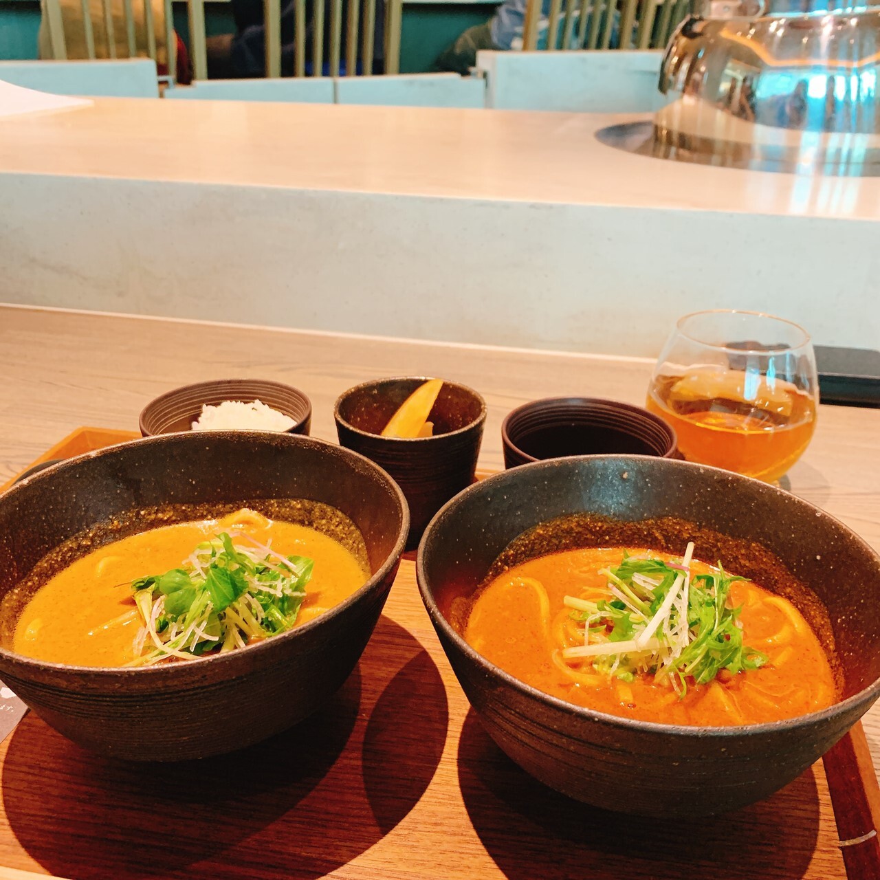 うどんは普通のカレーとトマトカレーのハーフにしました。