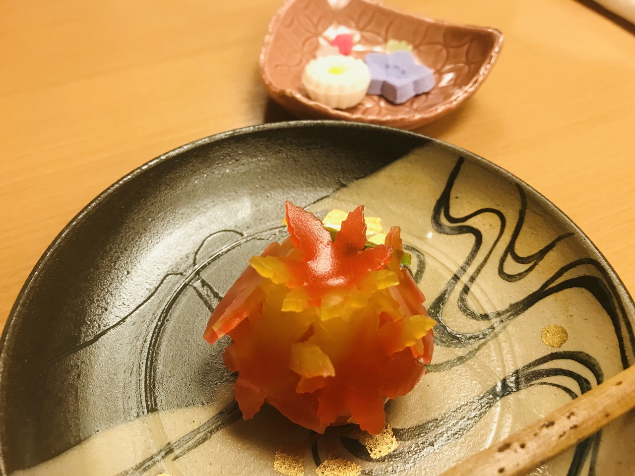 お抹茶と上生菓子のセット1000円を頂きました。お抹茶はホールのアルバイトの方が点ててくださいます。上生菓子は目の前にお持ちくださり、その中から選びます。季節の紅葉をいただきました。金平糖がとても美味しかったです。