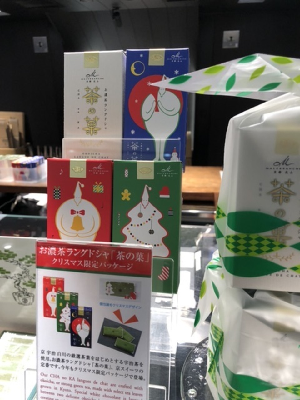 お濃茶のラングドシャの3枚入りのクリスマス・パッケージが出ていたので、お土産に購入。箱の感じがちょっとグリコっぽいです。