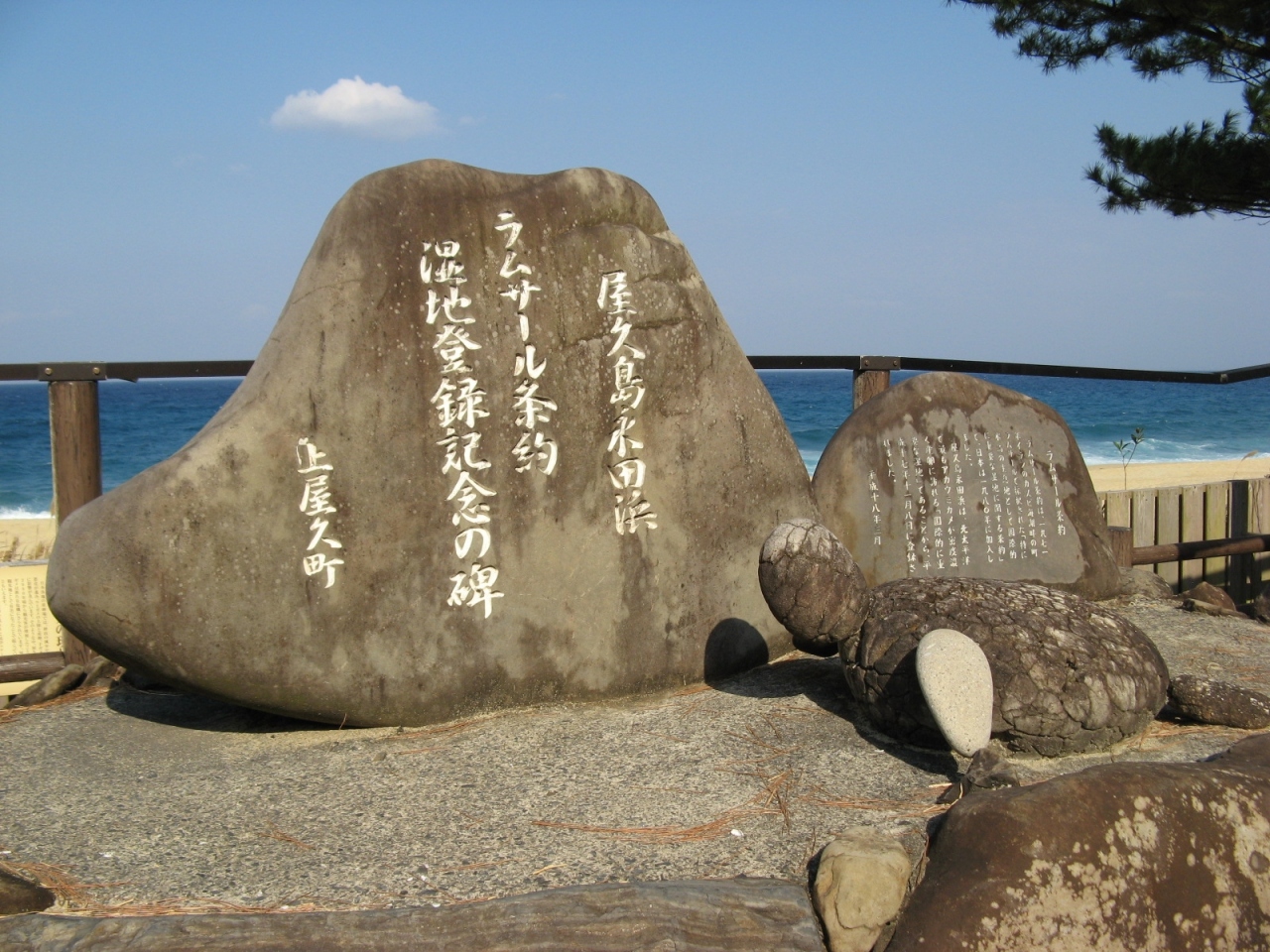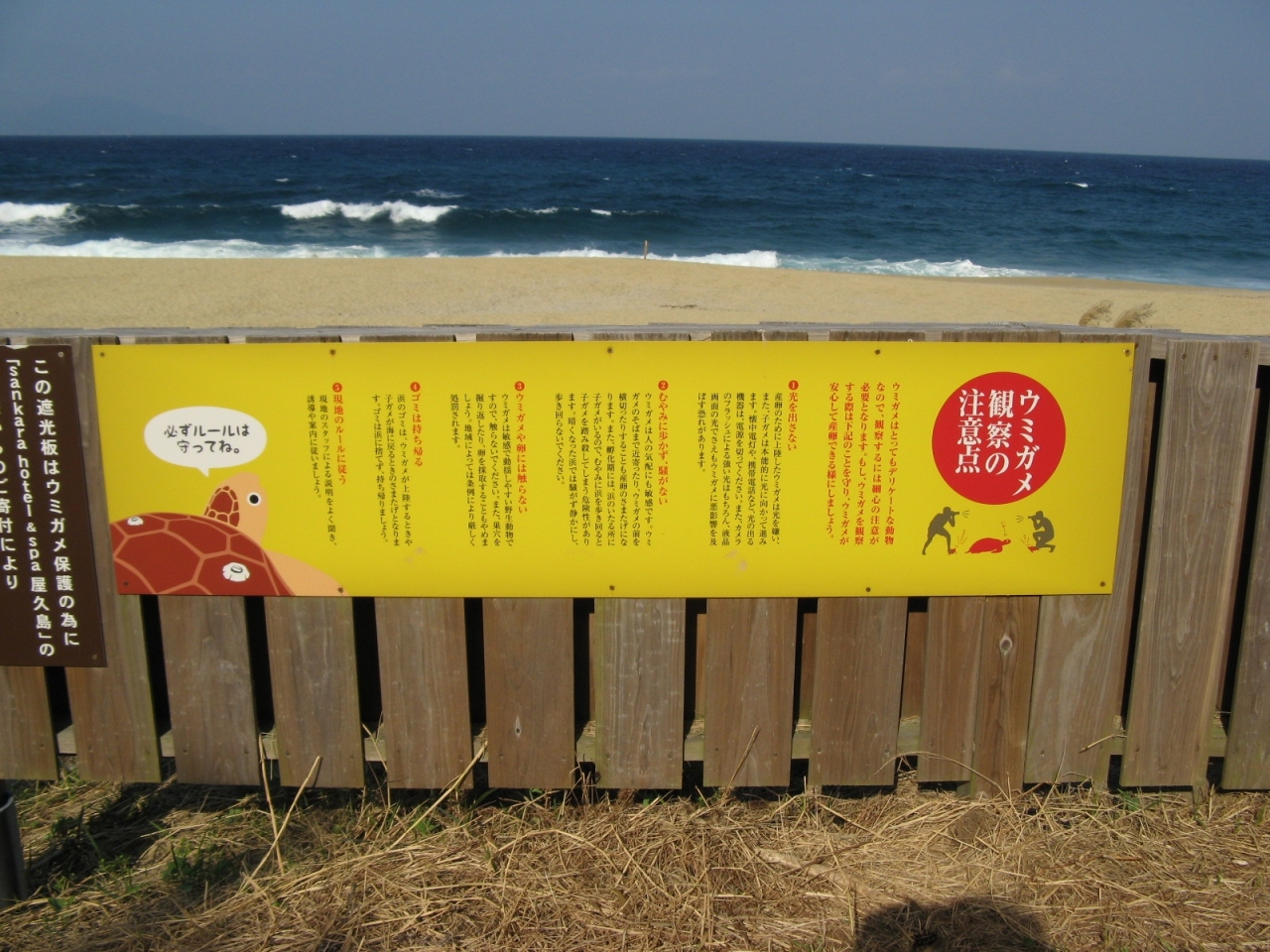 日本一のウミガメ産卵地です。現地にある説明板(添付写真参照)によると、『屋久島では最も長い砂浜で全長800m。5月から8月にかけて500頭以上のウミガメが産卵のため上陸し、7月から8月にかけて孵化する』とか。訪れたのが11月上旬の平日で、観光客は全くいなくてエメラルドグリーンの海と白い砂浜は美しく、さすがウミガメが産卵するビーチだけあるなあと思いました。トイレや駐車場が整備されていて駐車場の傍に売店もありました。近くにはウミガメの上陸や産卵状況の写真パネルや剥製等を展示する“うみがめ館”もありました。