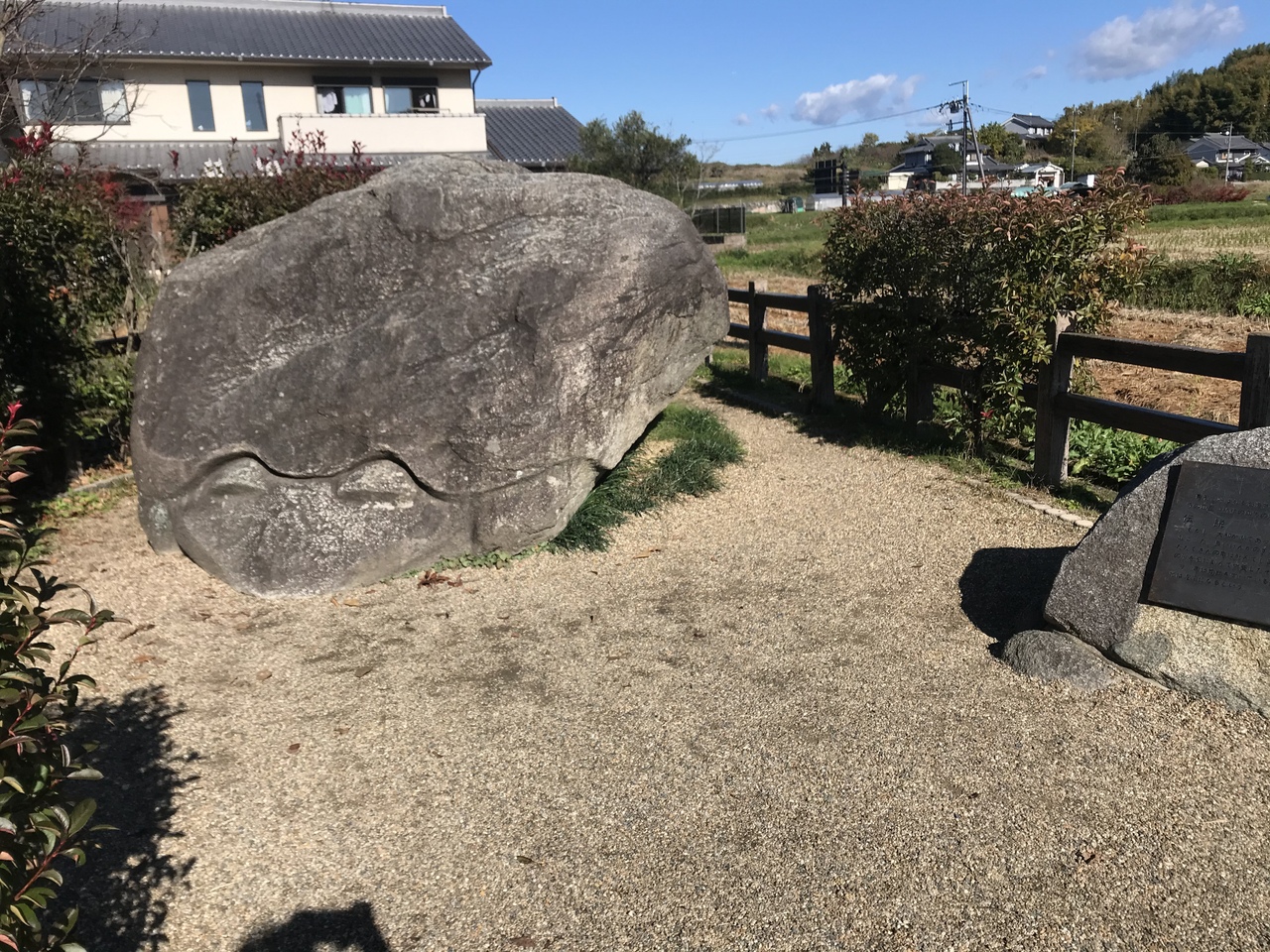 この石の由来は、川原寺の領地南西端を示すという即物的な説と、伝説があって、伝説ではこの石が西側を向くと奈良盆地が一面の泥の沼に…という恐ろしいものです。