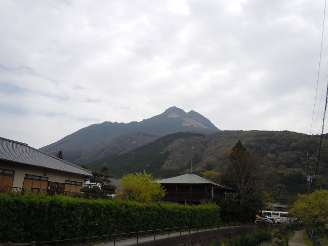 宿の2階から由布岳がきれいに見えたので、特に見ようとか写真を撮ろうと考えていませんでした。徒歩で金鱗湖へ向かう途中、ふと前方をみると由布岳が目に飛び込んで来てビックリしました。住宅地の合間から特徴のある山の形がくっきり見えるんですね。