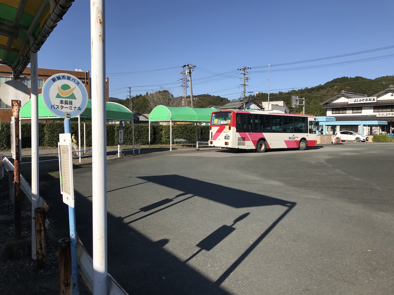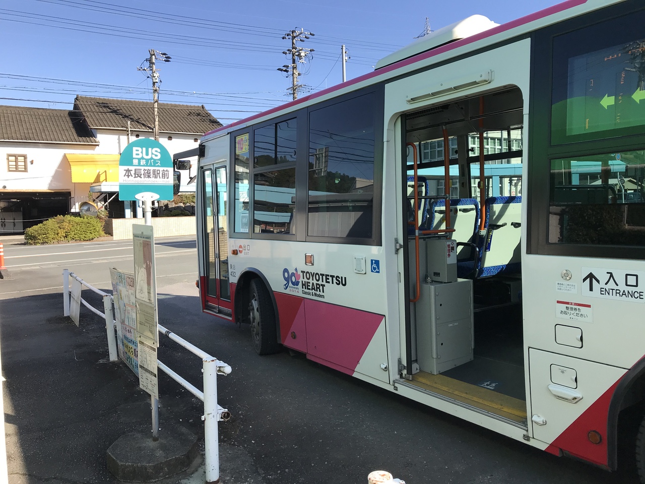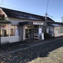 狭い駅前にはバス乗り場がなく、駅前の街を真っ直ぐに進むと国道には出る。左手に広いロータリーが駅前のバス停となり、駅より徒歩2分程。