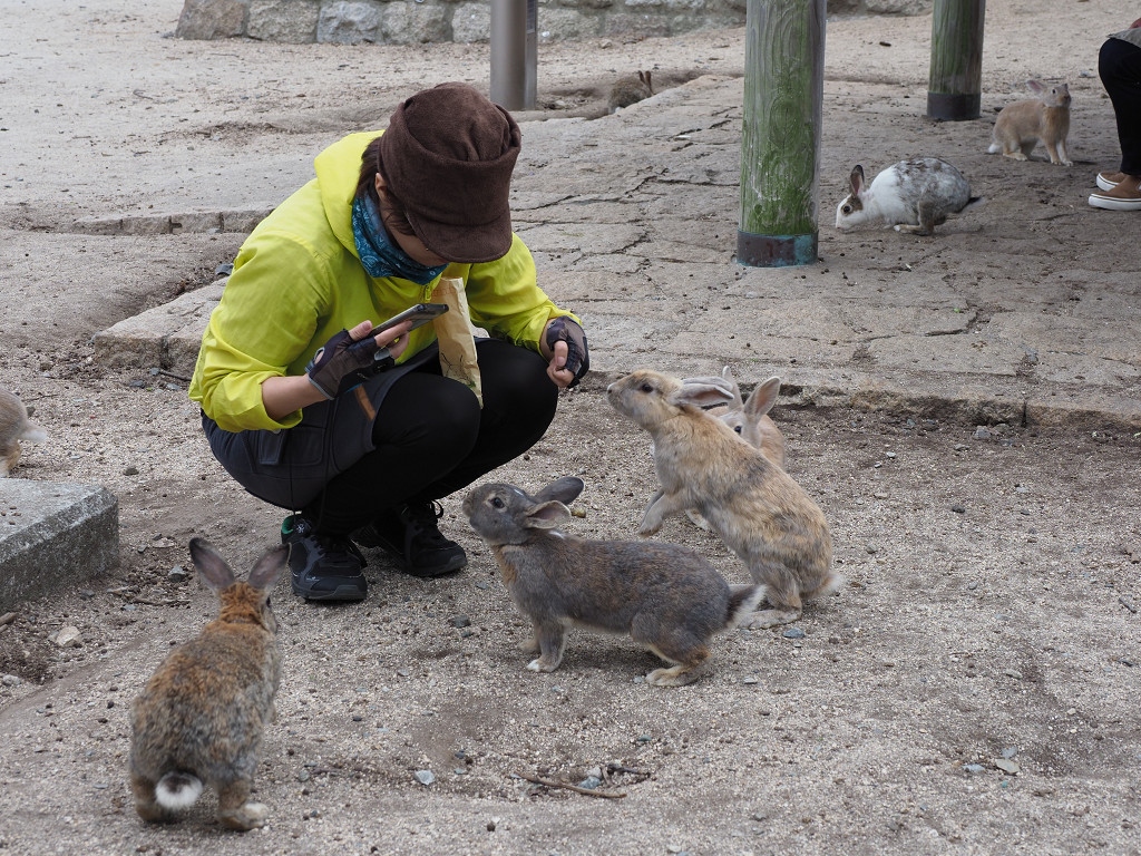 島の奥にいっても個数は変わらず、フェリーを降りてから右側にいくとかつての発電所跡がありますが、このあたりがうさぎとのふれあいではベストかもしれません。