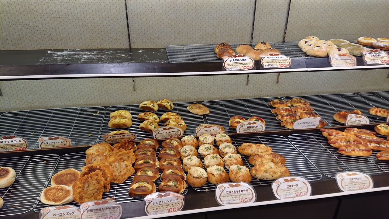京都発祥で大阪と九州一円で展開する「伊三郎製ぱん」の戸畑イオンにあるお店。ほとんどの調理パンや菓子パンが100円(税抜)という格安ですが、焼きたて。メニューが多いのも特徴で、例えば同じウインナーを使ったものでも、カレー風味にしたりホットチリになったりと飽きさせない。100円で販売するためだと思いますが、自分でビニール袋に入れてレジで会計をするのは意外と新鮮。