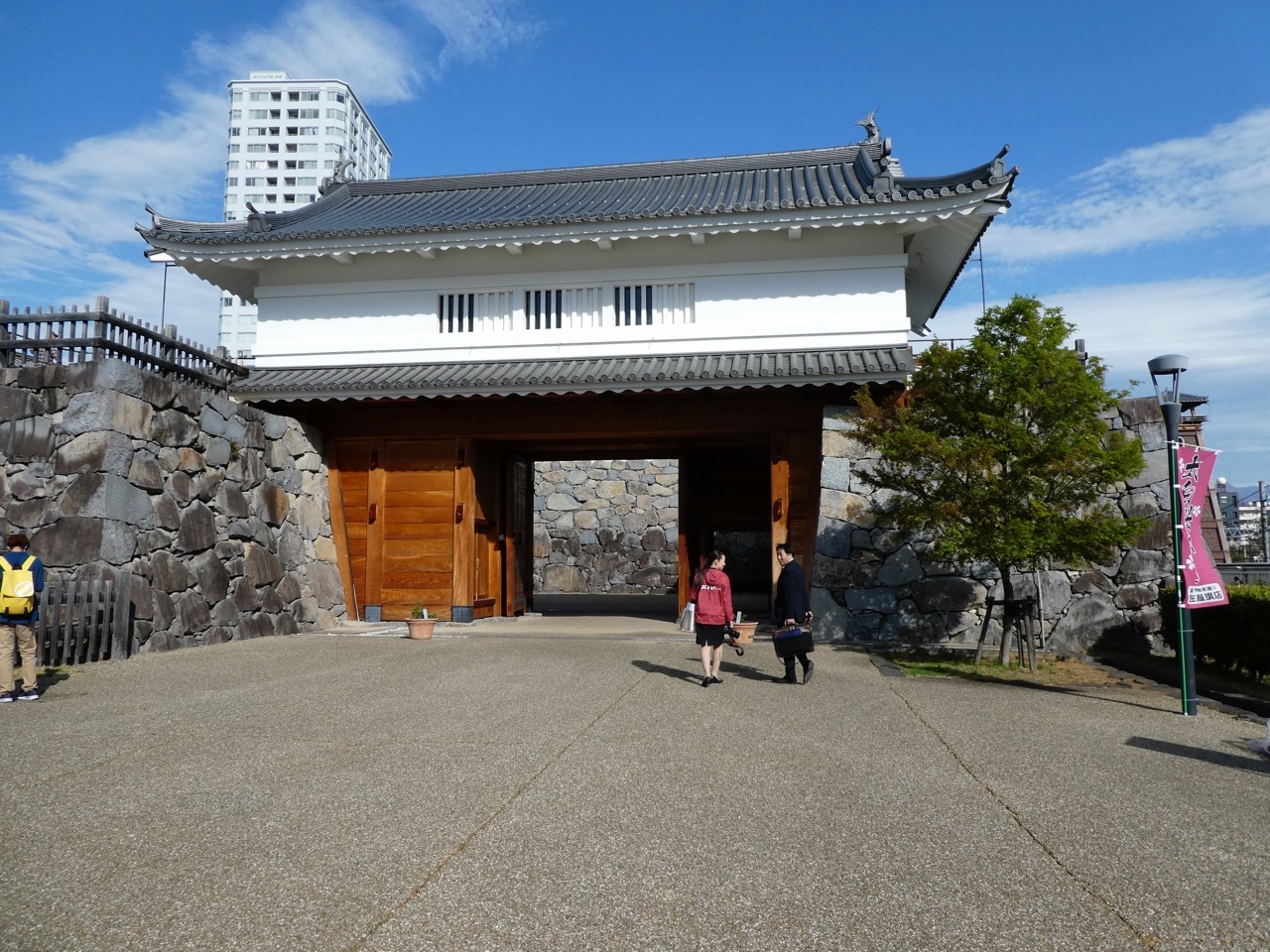 門の上に櫓が乗った形式で立派な門です。まだ木の目もきれいで、再建から時間がたってないようです。そばの石垣も大きく立派で、甲府城の全体を昔に戻せたらな、とか、甲府駅が地下化されないかな、とちょっと思ってしまいました。
