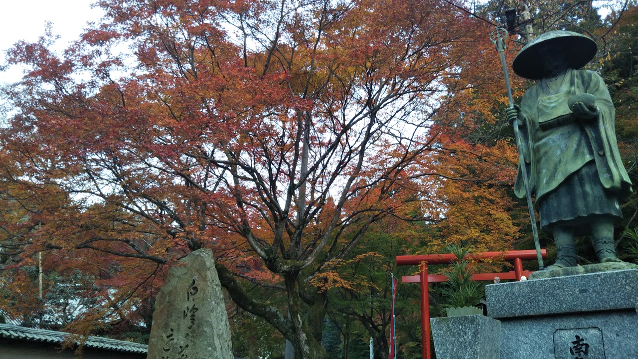 四国八十八ヶ所霊場巡りで、初めて行きました。白峯山の上にある名刹でした。細長い参詣道を進み、左に曲がり、右側の石段の上に本堂がありました。周りの木々がちょうど紅葉で美しかったです。早生みかんが無人販売されていました。