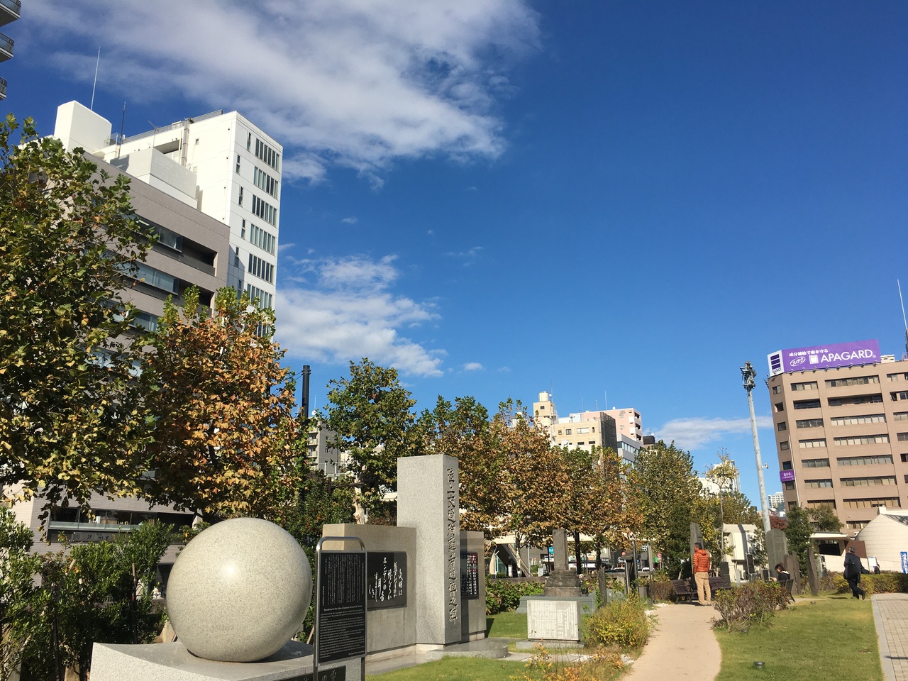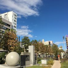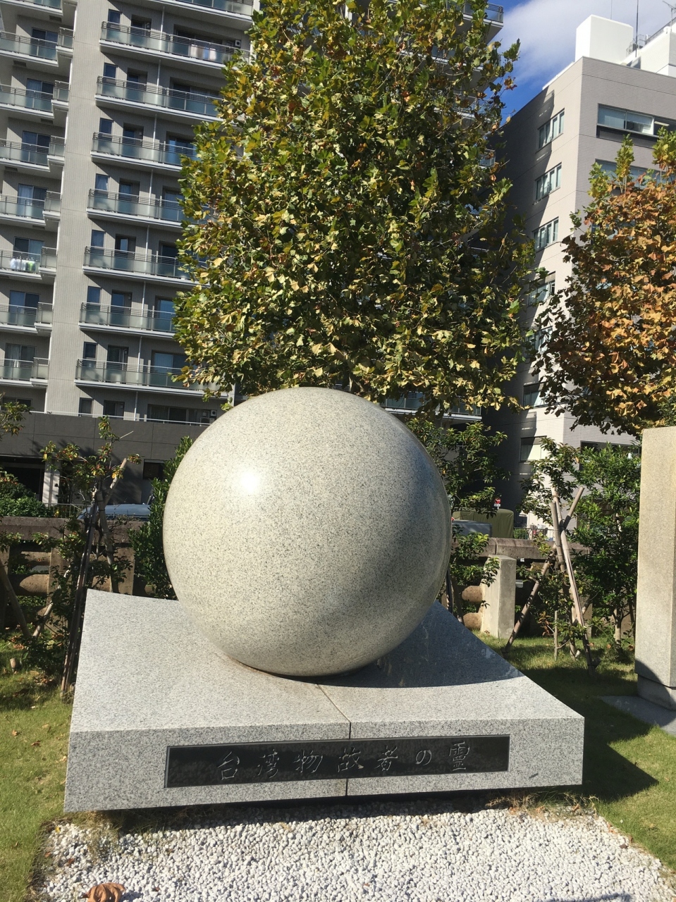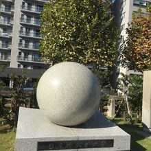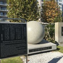 石碑は、野球のボールを大きくしたような石碑で、横には日本語と英語ので説明看板がありました。築地本願寺境内の石碑が並んだ一番左端日本語あり、目立つ石碑でした。平成29年4月と看板に記載があったので新しい石碑でした。