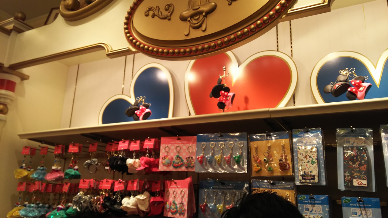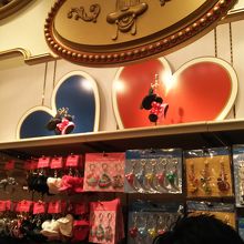 ワールドバザールにあるグッズ販売店舗です。とても混雑しています。イベントグッズや、キーホルダー、ぬいぐるみなどのおもちゃが売られています。