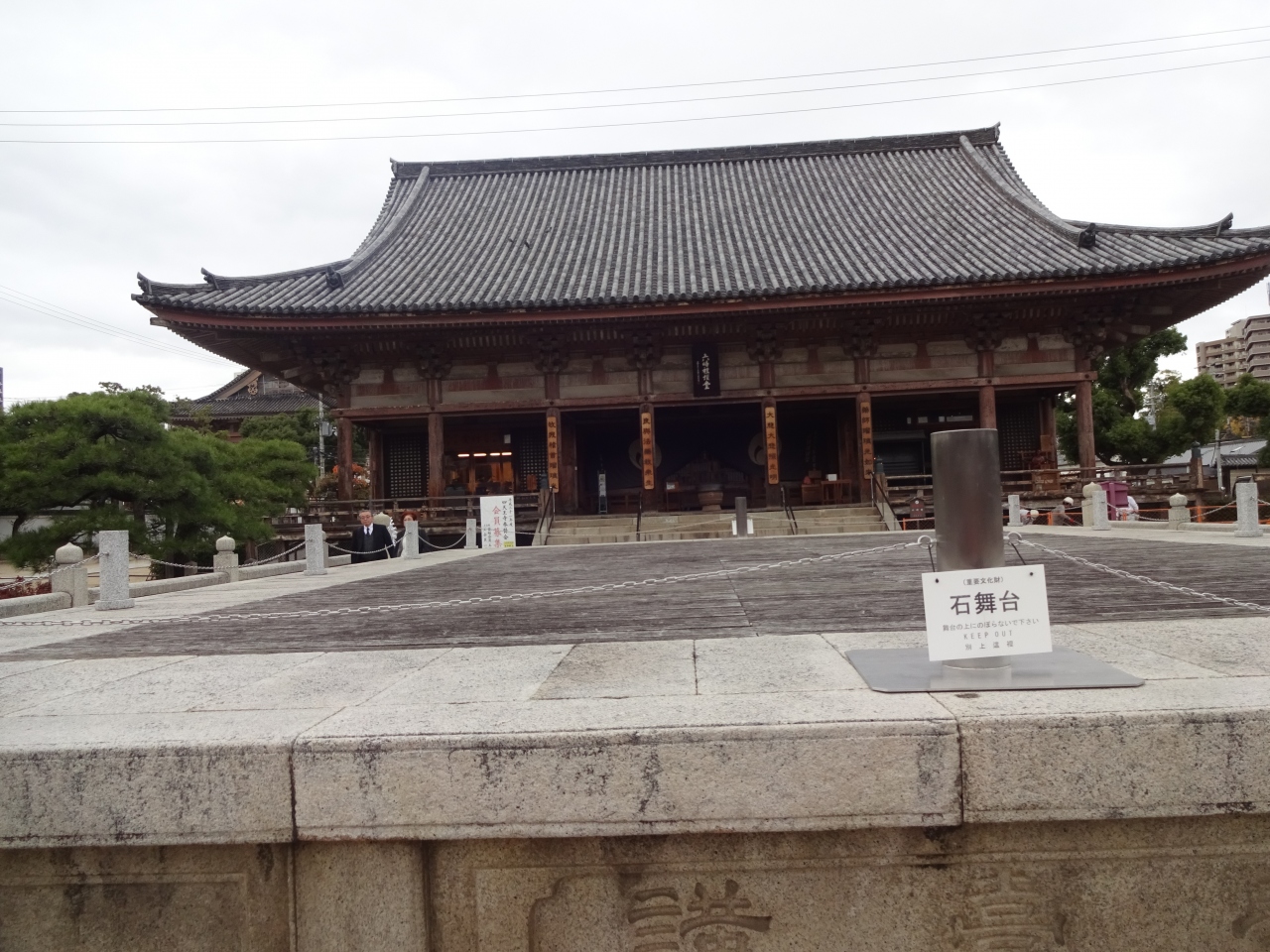 四天王寺の境内ほぼ中央部分に亀の池があり、その池にかかる橋の上に四角い石の舞台があります。