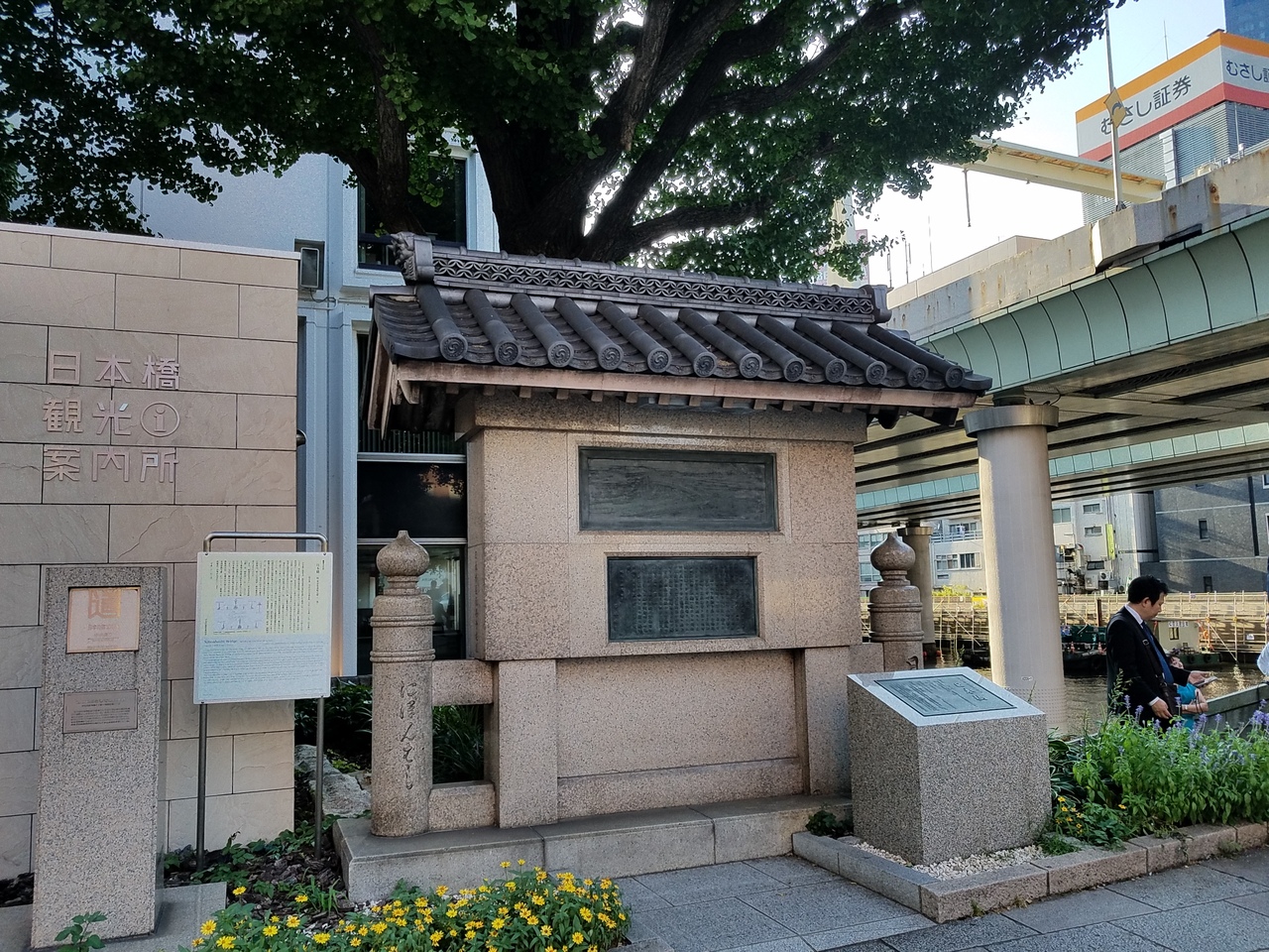 日本橋の南側に、日本橋の由来を記した立派な石碑があります。石碑は昭和初期に立てられたもので読みずらいですが、1603年に架けられて国内街道の起点になったこと、江戸時代から商業、文化の中心であったことなどが記されており、理解を深めることができました。