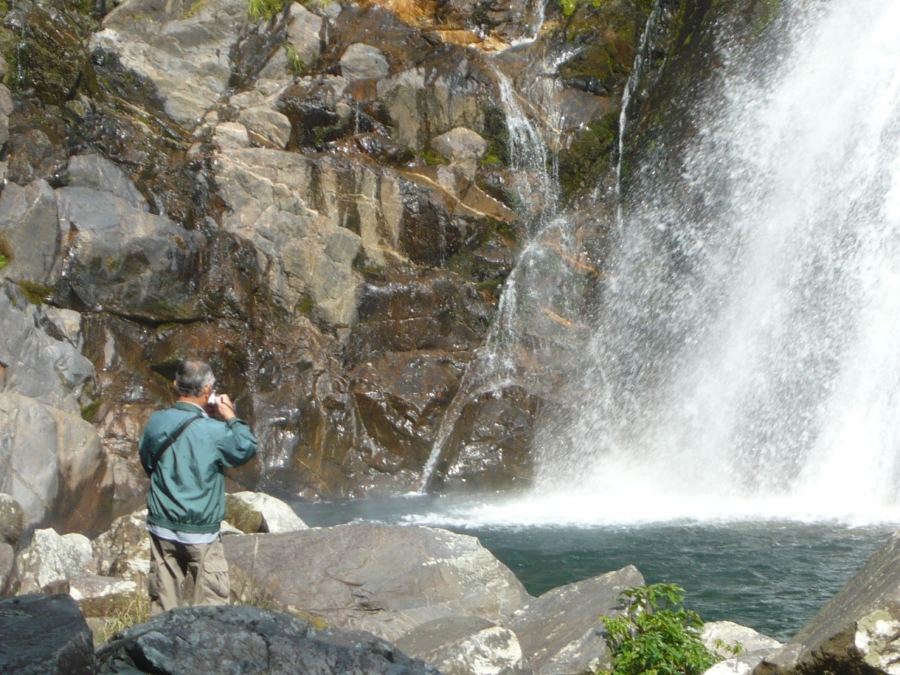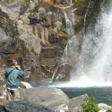 展望台にあった説明板には『落差88m』とありました。水量が多くい時は滝が2本になるそうですが、訪れたときは水量が比較的少なく流れは一本でした。岩場伝いに行くと滝の直下まで行くことができ、水しぶきを浴びながらマイナスイオンを堪能しました。
