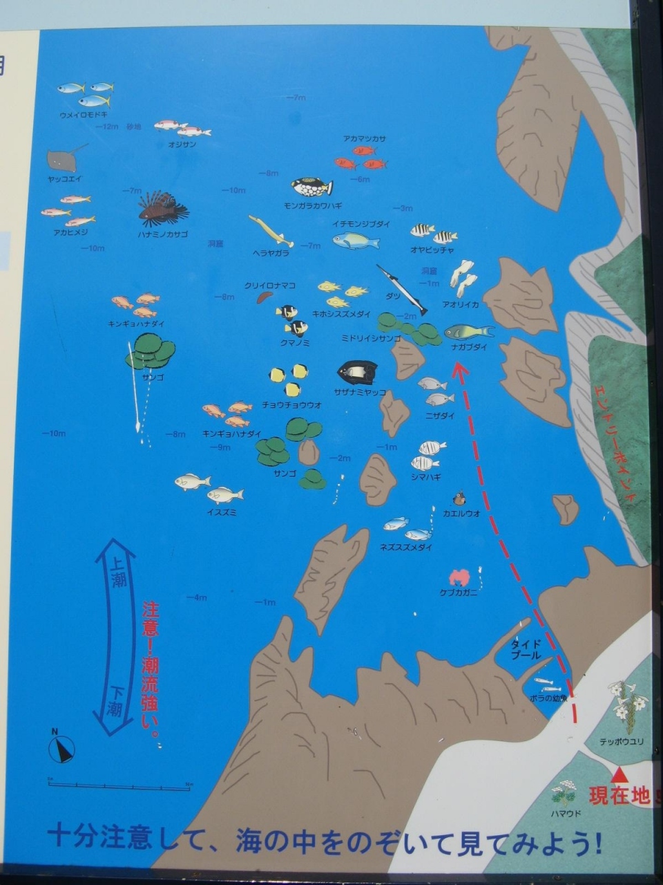 現地に「塚崎タイドプール アドベンチャーマップ」という表示板(添付写真参照)があって、観察路や観察ポイント表示されていたのでそれに従って観て回りました。潮溜まりにいる小さな熱帯魚や貝などを観察したり、サンゴ礁を見たり、ゆっくりした時間を過ごすことができました。干潮時間を確認して行くのが良いでしょう。