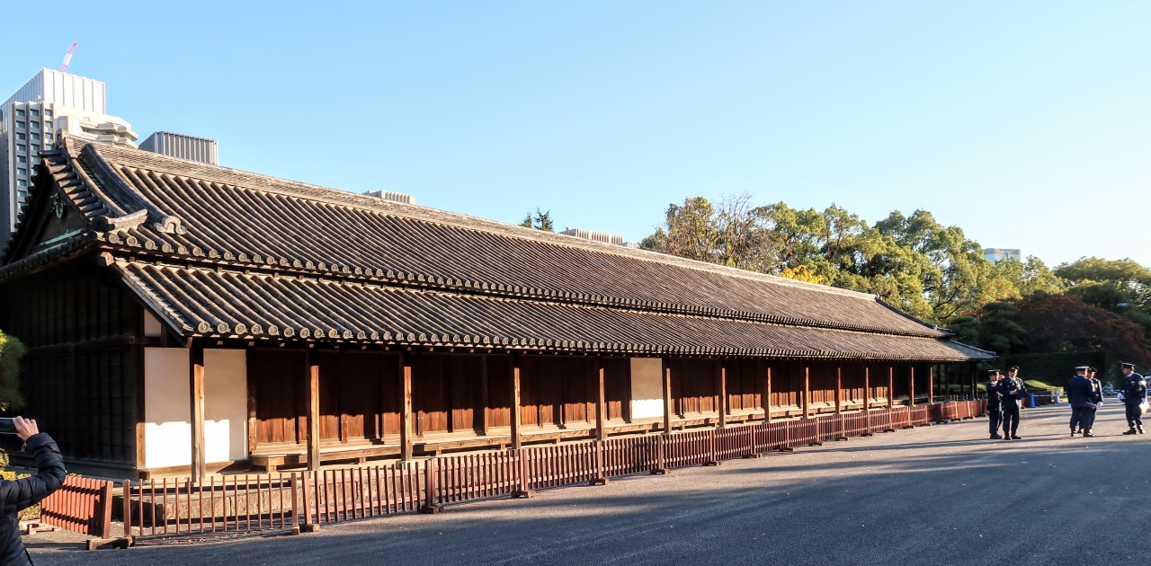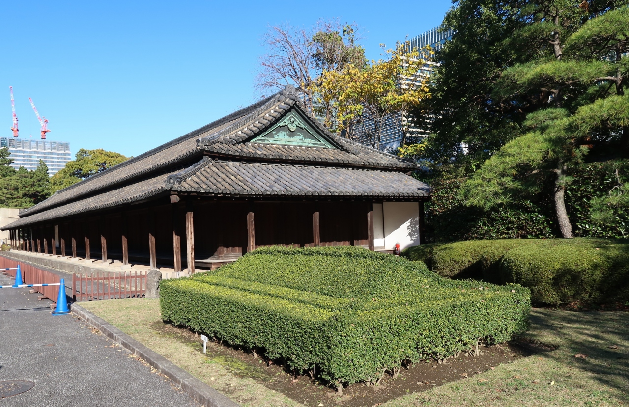 本丸へ入る時には、建物横の庭の植木の一つが、百人番所の建物の形に刈り込んであるのが見え、庭師さんの遊び心が伝わってきました。帰りには、江戸時代の警備詰所前に、現代の警備員皇宮警察の方々が働いている姿も見え、タイムトラベル的な時の流れを感じました。