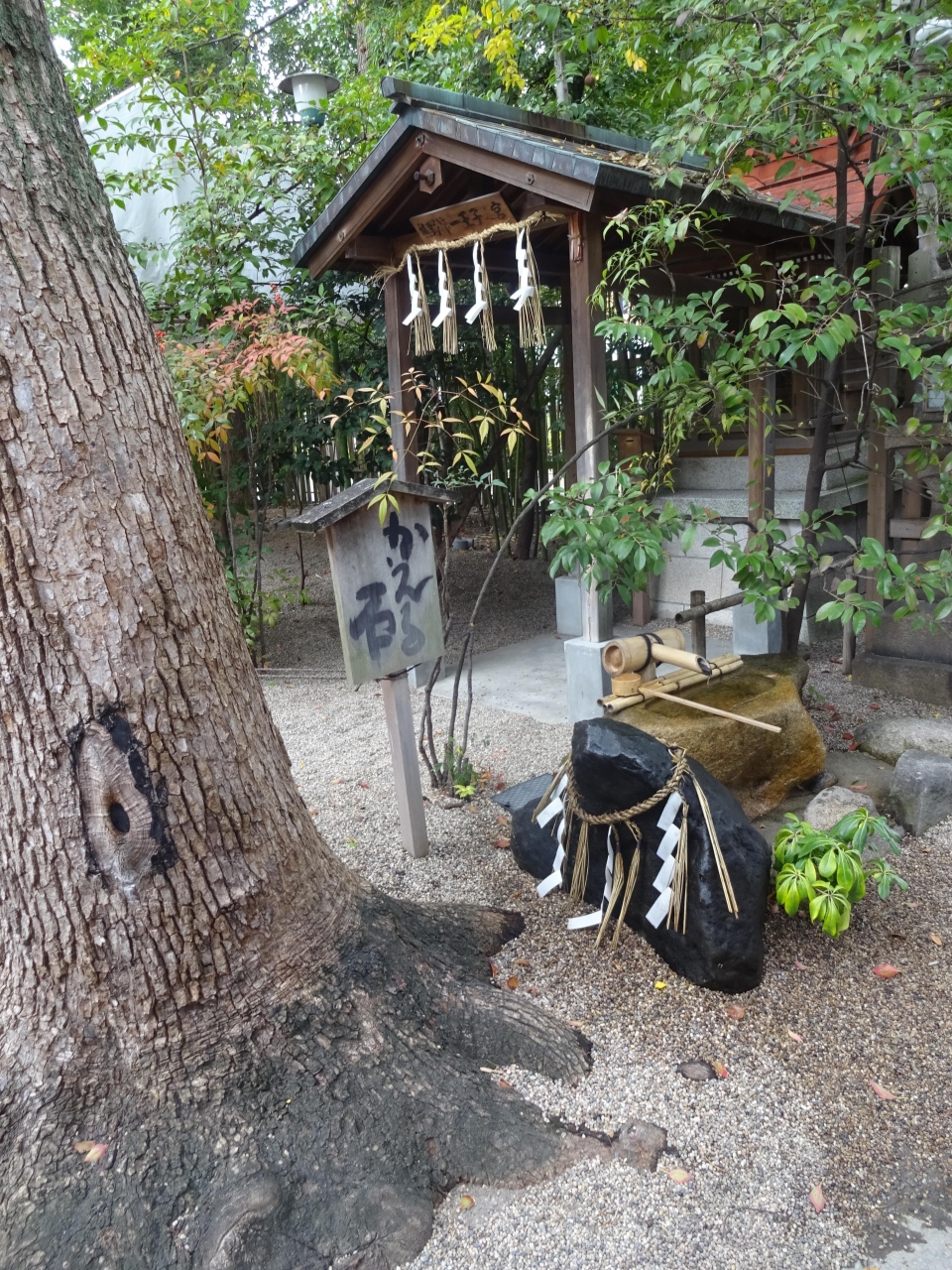 木々が色付いた境内を歩いていたら、その中に黒い石がありそ場に「かえる石」と書かれていました。