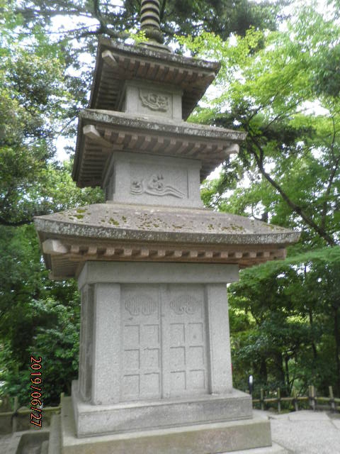 兼六園に作られた栄螺山という低い山の上にありました。三重の宝塔は、戸室山で切り出された石が使われていて、12代藩主斉広公の供養のために建てられたものだということを調べて知りました。どっしりと立派な石の塔でした。