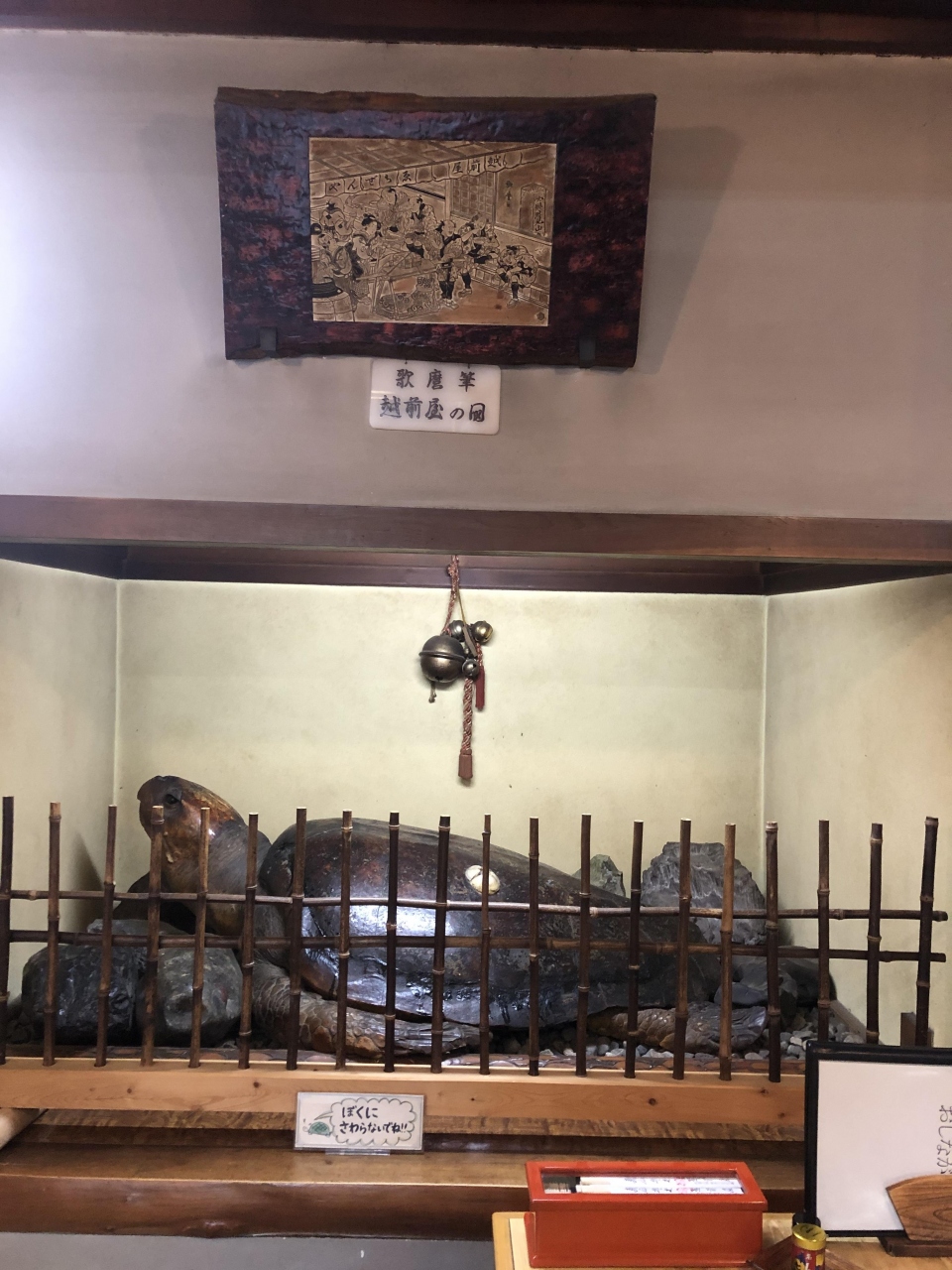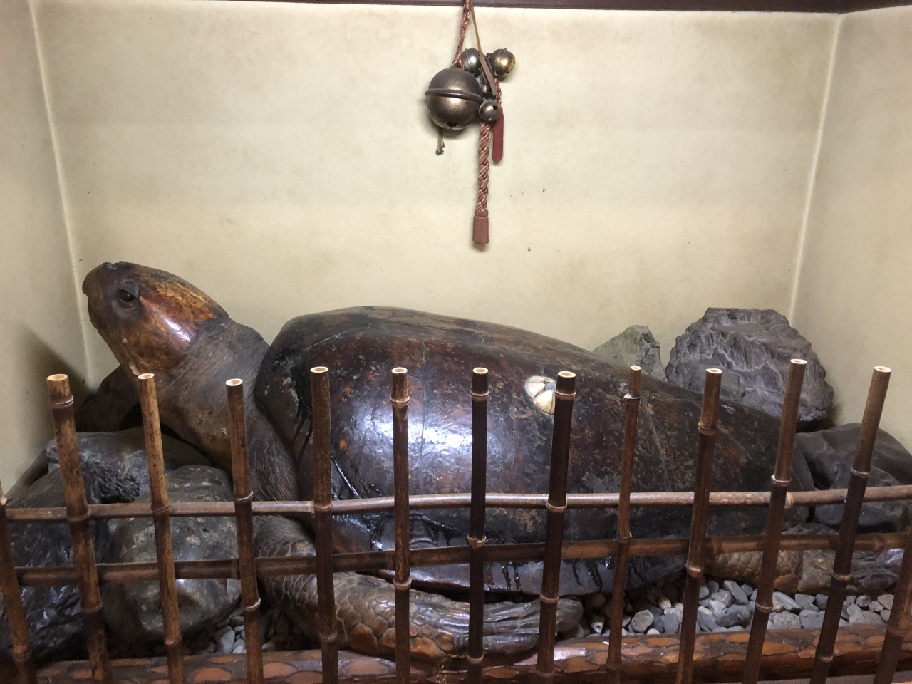 店内にある大海亀のはく製は、一見の価値あり、大海亀の上には