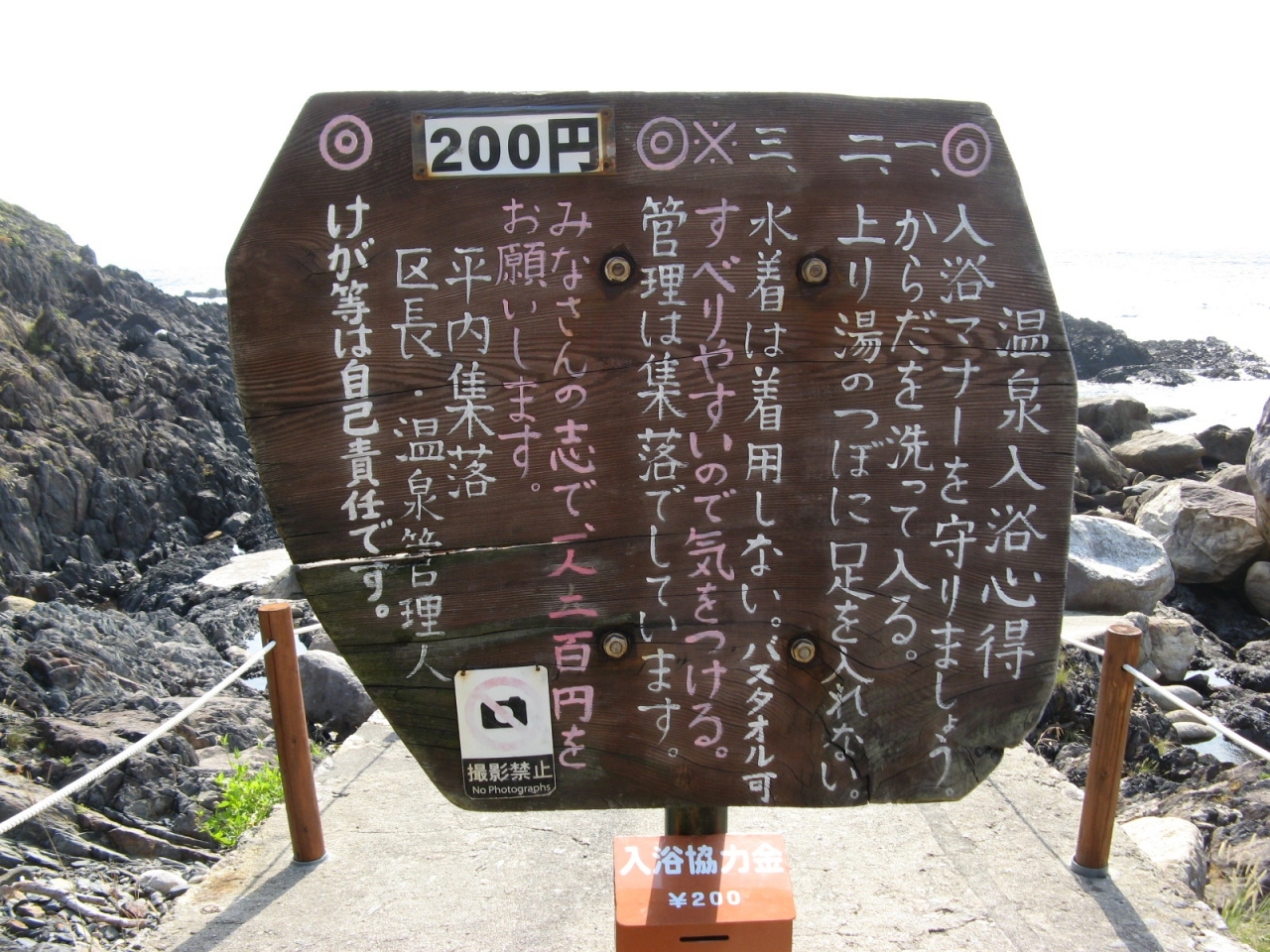 浴槽に至る通路に料金(志)を入れる箱があり、200円を投入して入ります。脱衣場等はなく水着も禁止の混浴なので、女性は「湯浴み着」での入浴がおすすめです。