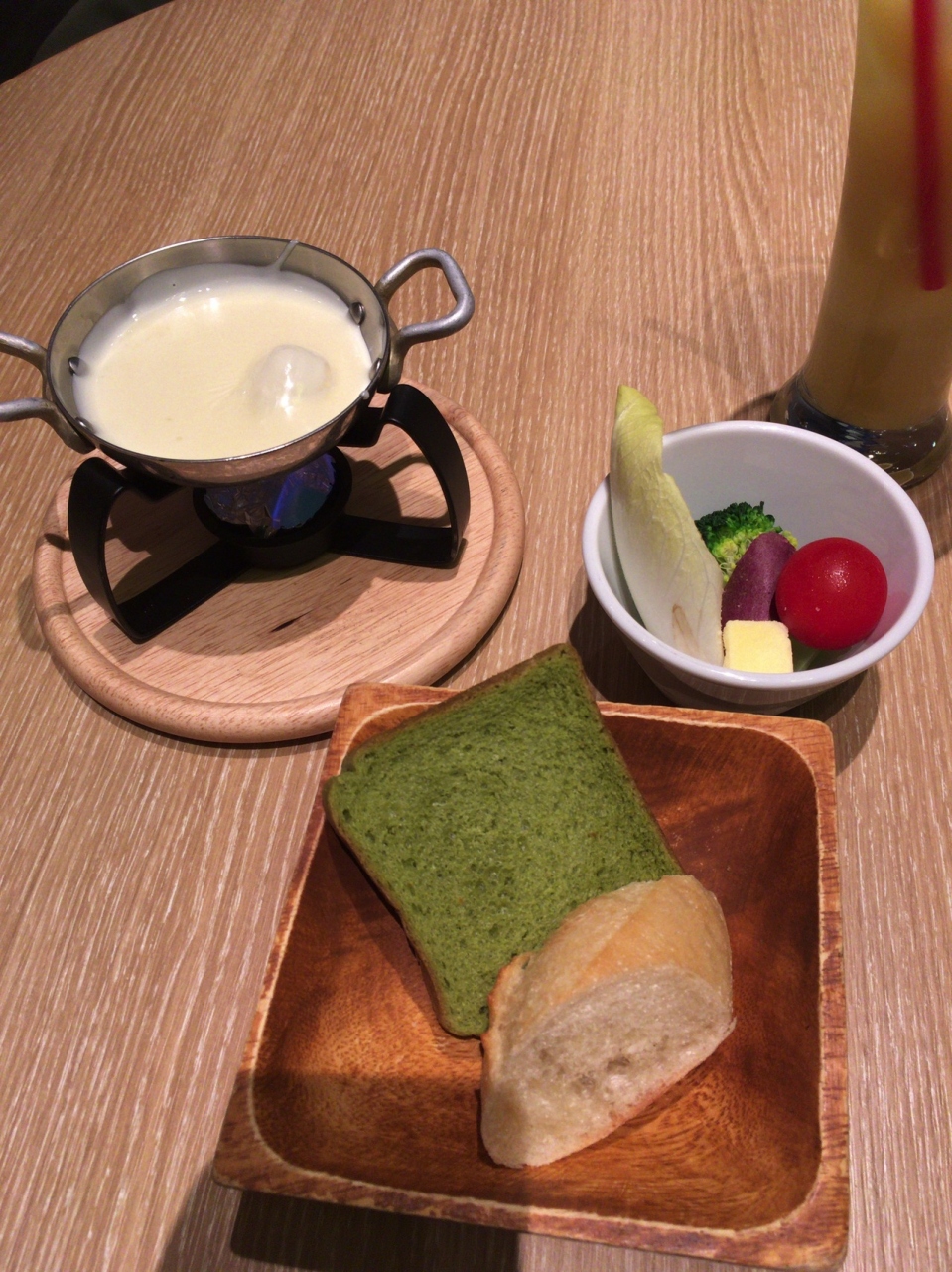 サラダのチーズフォンデュ、パン食べ放題もついてコスパ良しです。
