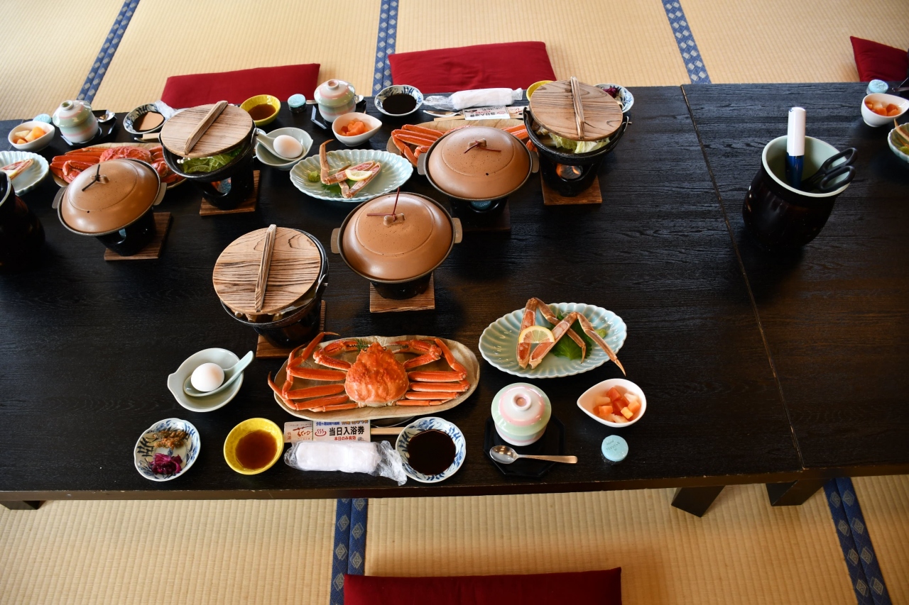 お昼の時間帯に、蟹を食べました。広い庭を見渡せる大きな座敷で、百人ほども入ることができるような広間でした。蟹は小ぶりで、一人二杯という謳い文句でしたが、期待していた程ではありませんでした。食後は庭を散策しました。おんせn