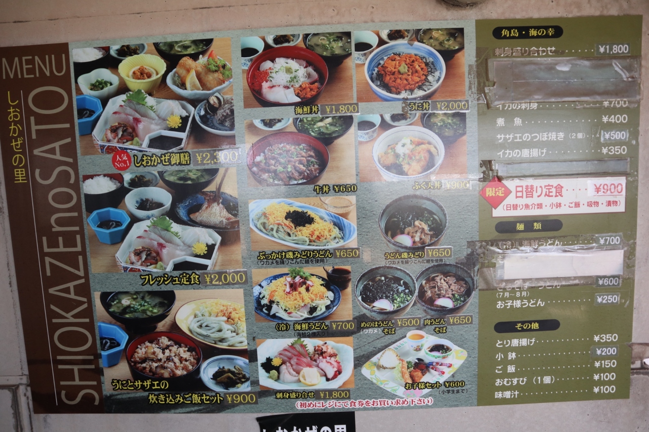 角島にある休憩スポット。ここで食事することもできるし、お土産もたくさん揃ってます。レストランのメニューは海鮮丼などがあるけど、値段はわりと高め。日替わりはお得ですが、すぐ完売すると思います。海がすぐ近くなので、夏は海水浴場に行く人の駐車場としても使われてるみたいです。