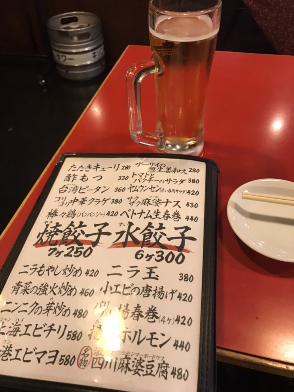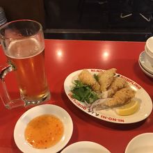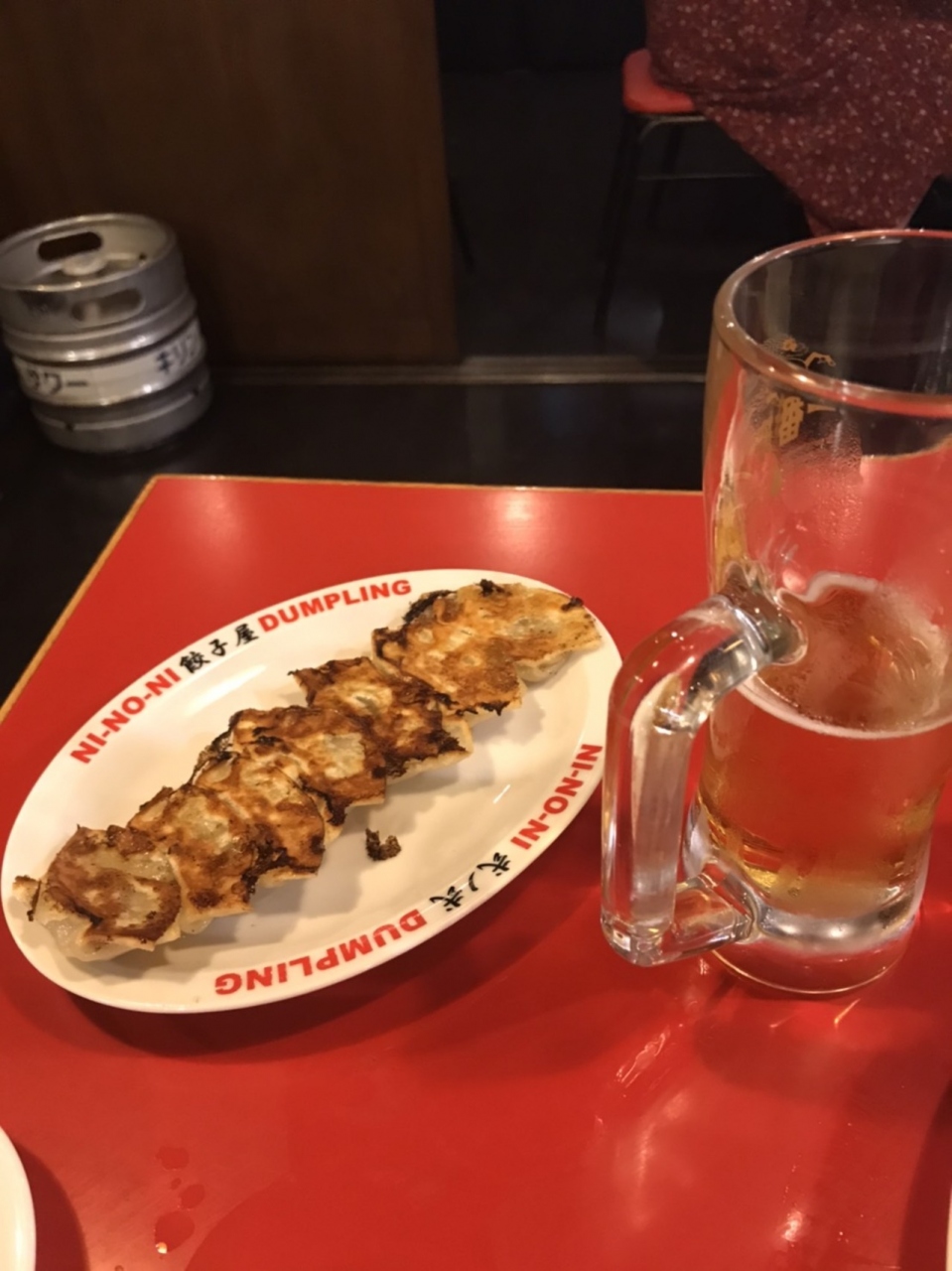 天神にある餃子屋です。行列ができていたので、つられて入店。餃子は一皿250円。小さいので、軽く食べられます。17:00から18:30までは、ハッピーアワーで、ビールだけでなく、餃子も半額になるのでお得です。