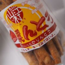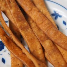 小麦粉ベースの生地に栗を練り込んで、薄く延ばして短冊切りし、カリカリに揚げたもの。