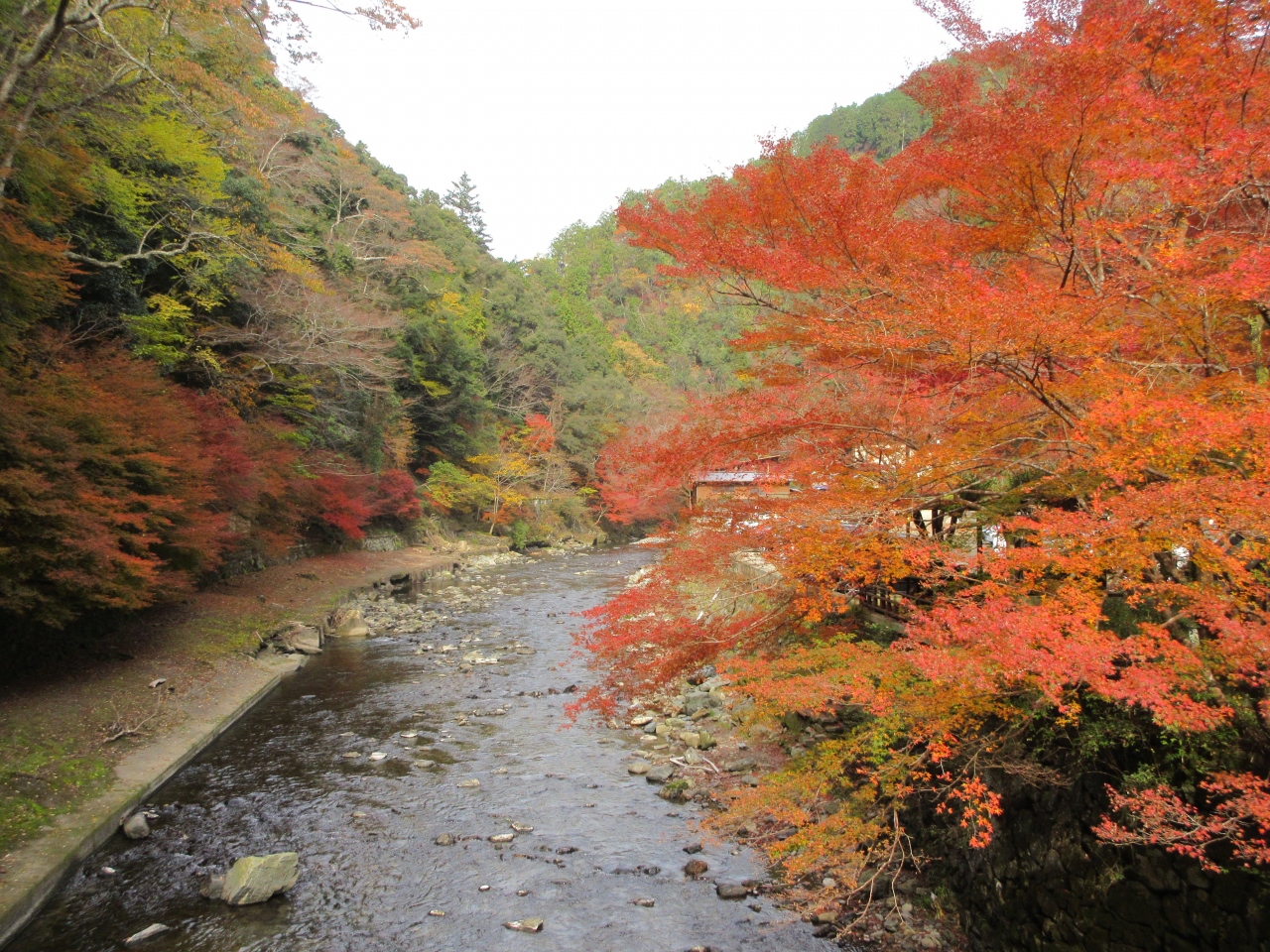 紅葉時期に高雄三尾巡りをしました。清滝川沿いに歩きました。川底の石が見えるくらい澄んだ川でした。歩いた場所の両岸にモミジなどの木々があり紅葉していてきれいでした。流れは穏やかで、神護寺へ行く高雄橋や西明寺へ行く指月橋は欄干が朱色で周りの紅葉に映えました。ハイキングコースがあることを後で調べて知りました。神護寺の参道は曲がりくねった長い石段で足が疲れたので清滝川に戻ってきた時はほっとしました。澄んだ流れと紅葉にいやされました。