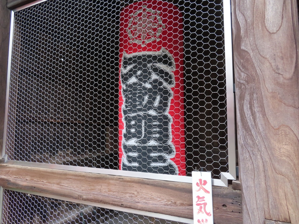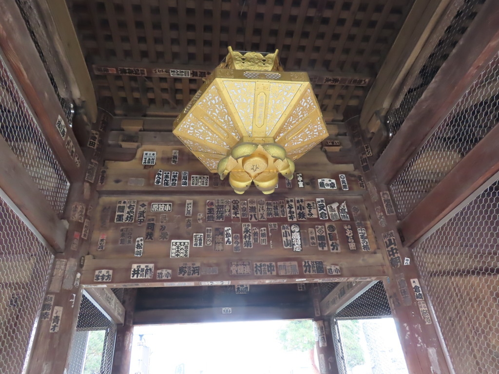参道の門前町商店街を真っすぐ歩いて行くと川崎街道沿いに立つ立派な山門が仁王門です。本堂にも引けを取らない質実剛健の建物で、建物内には、不動明王と書かれた赤い提灯が飾られ、天井には、黄金色の作り物が吊るされ、千社札が貼られていました。