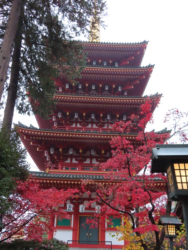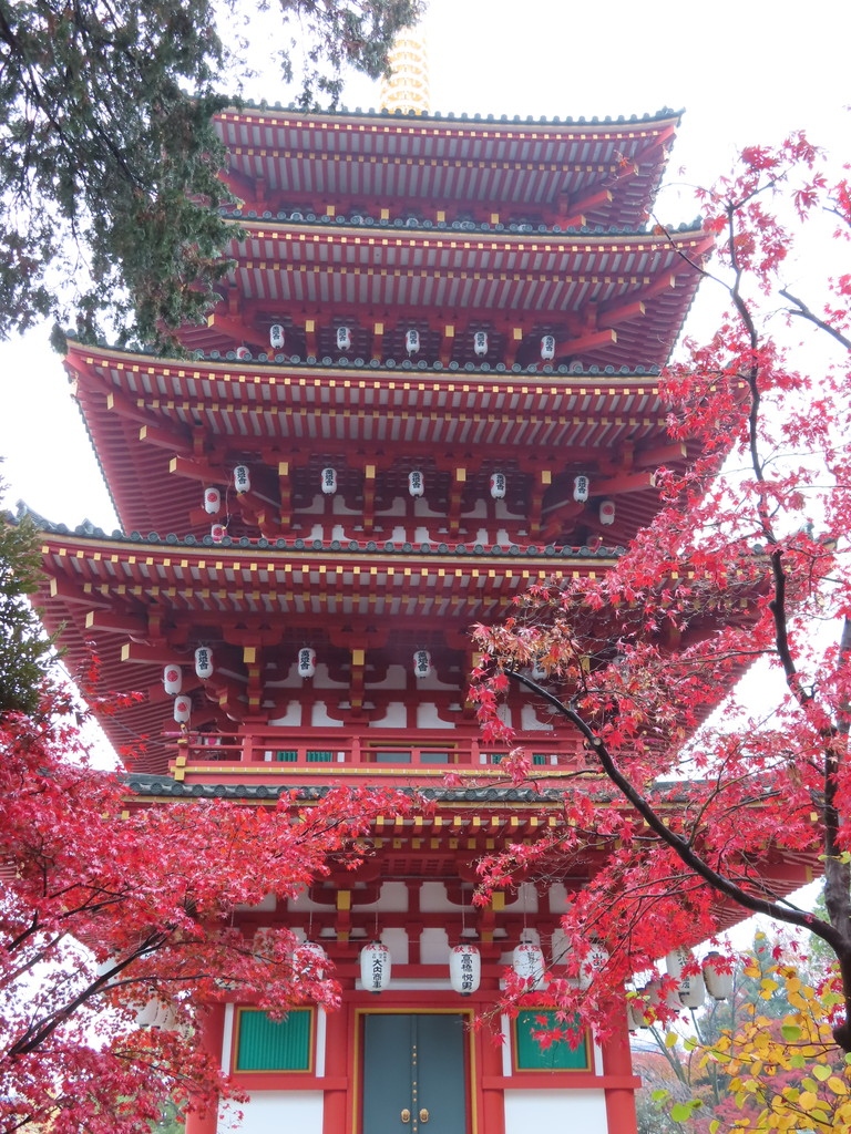 紫陽花と並んで高幡不動尊の見所の一つで、紫陽花は紫陽花の時期しか楽しめませんが、この五重塔は、四季折々、変わっていく周りの風景とマッチした光景を楽しむことができます。特に、紅葉時期の五重塔は、赤く染まったモミジとのバランスがよく、素晴らしいです。